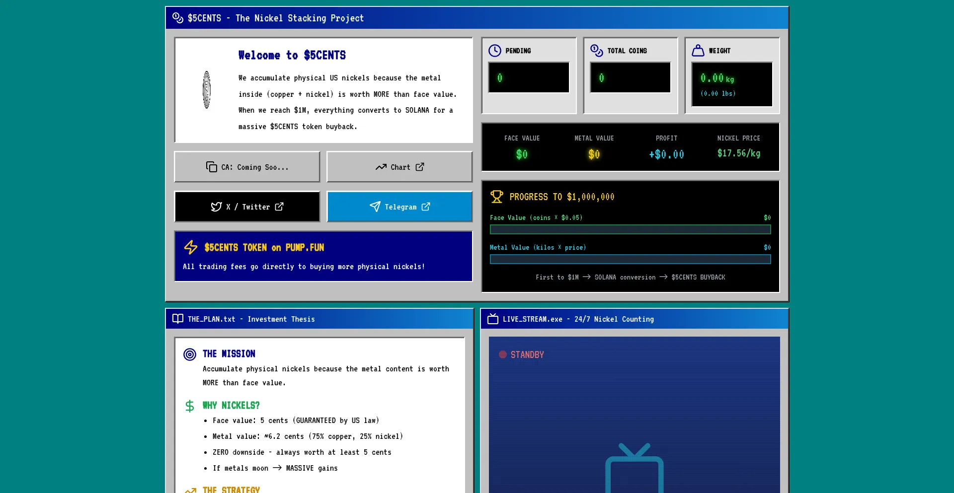 The ultimate nickel investment strategy. A nickel is worth 5 cents forever, but the metal inside is worth 6.2 cents. When we reach $1M, everything converts to SOLANA for $5CENTS...
