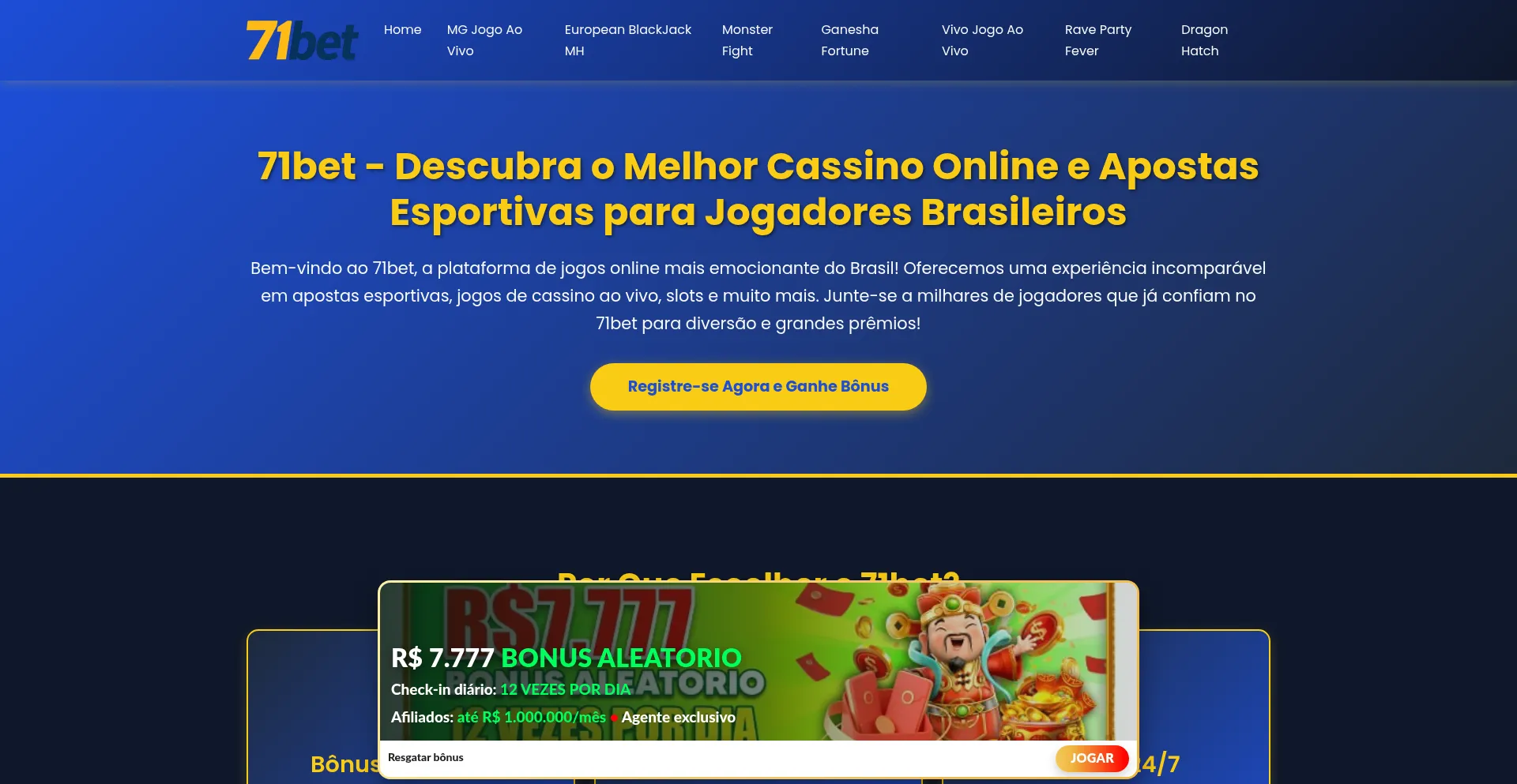 71bet é o melhor cassino online do Brasil com jogos ao vivo, slots, apostas esportivas e bônus incríveis. Registre-se agora e ganhe!