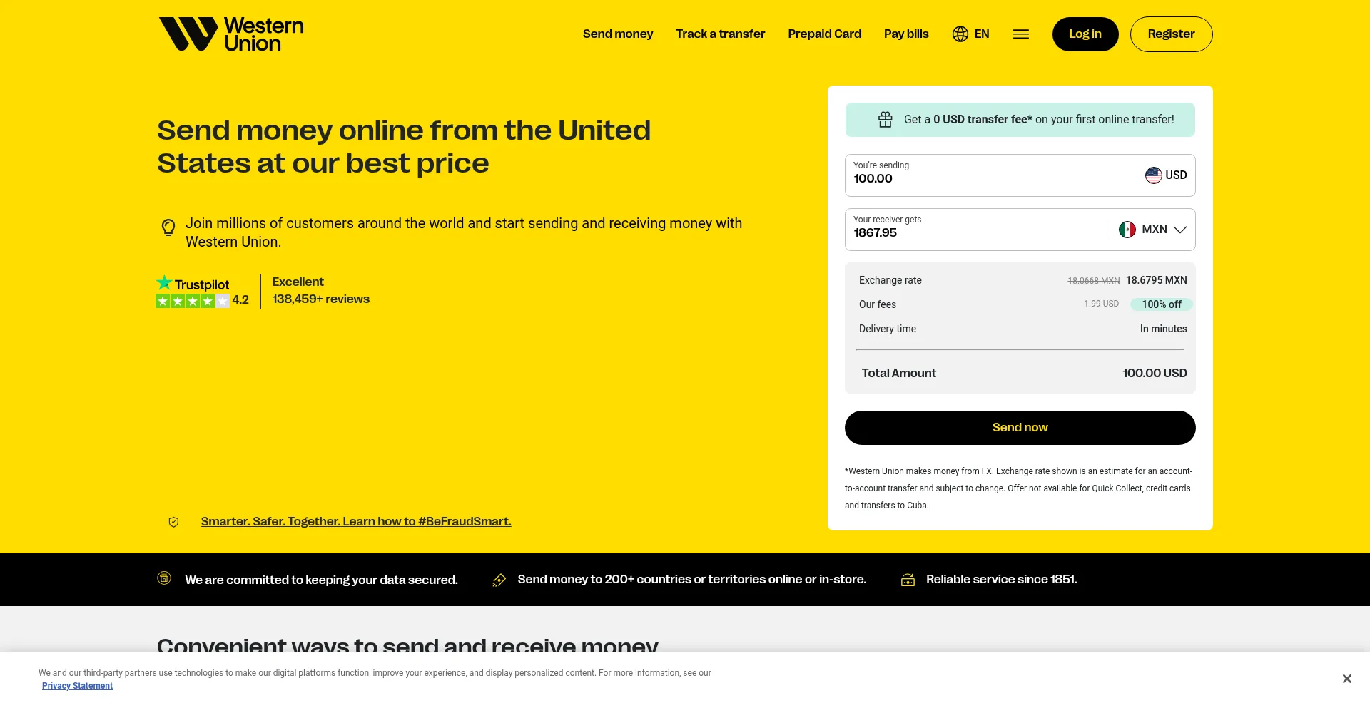Send and receive money transfers from the United States with Western Union. Check exchange rates, track transfers and send money online instantly.