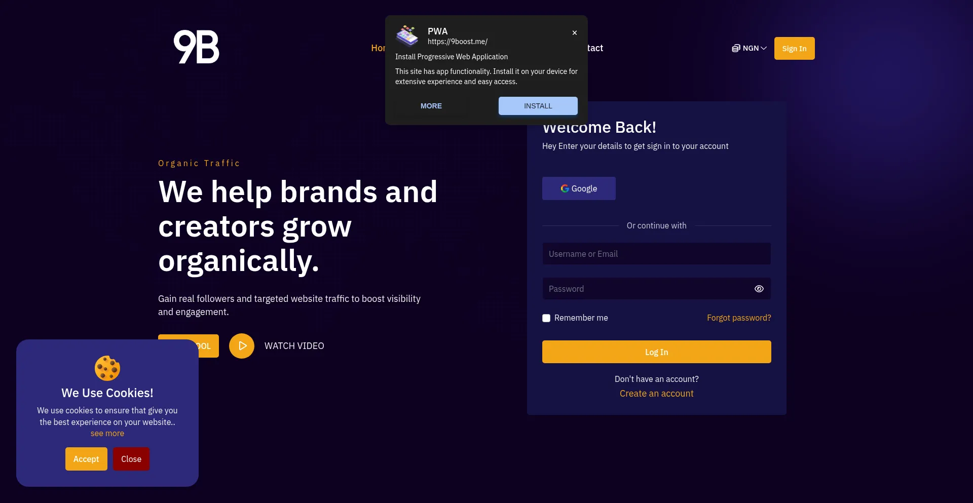 O site 9boost.me é configurado como uma aplicação web com funcionalidade de app móvel. Os usuários podem instalar este site diretamente no seu dispositivo para acesso rápido e uma experiência semelhante a uma aplicação.