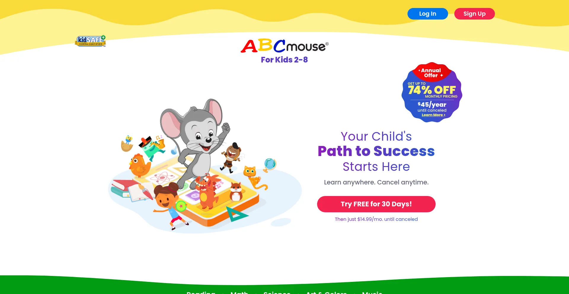 ABCmouse.com helps kids learn to read through phonics, and teaches lessons in math, social studies, art, music, and much more. For kids age 2 to Kindergarten.