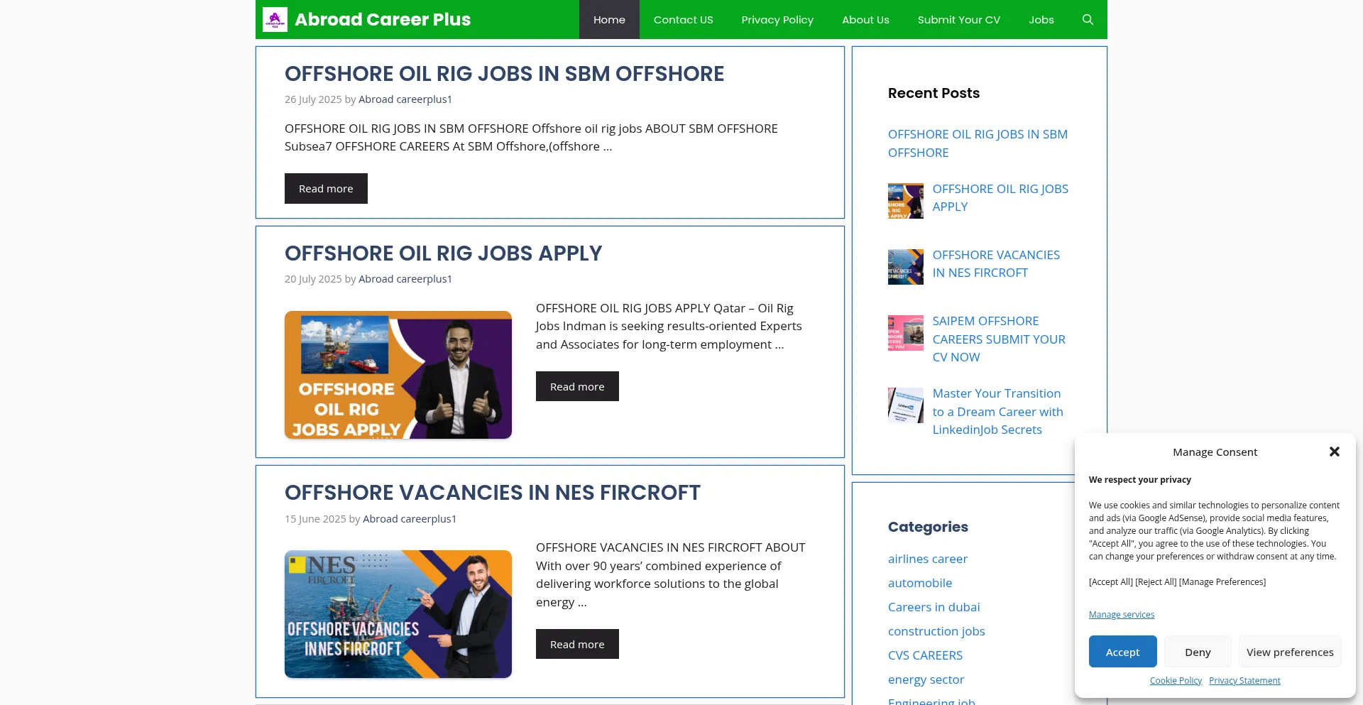 O site implementa mecanismos de consentimento de cookies em conformidade com regulamentações de privacidade como GDPR ou CCPA. Isso demonstra que abroadcareerplus.com adere a padrões de proteção de dados e fornece aos usuários controle sobre práticas de coleta de dados pessoais.