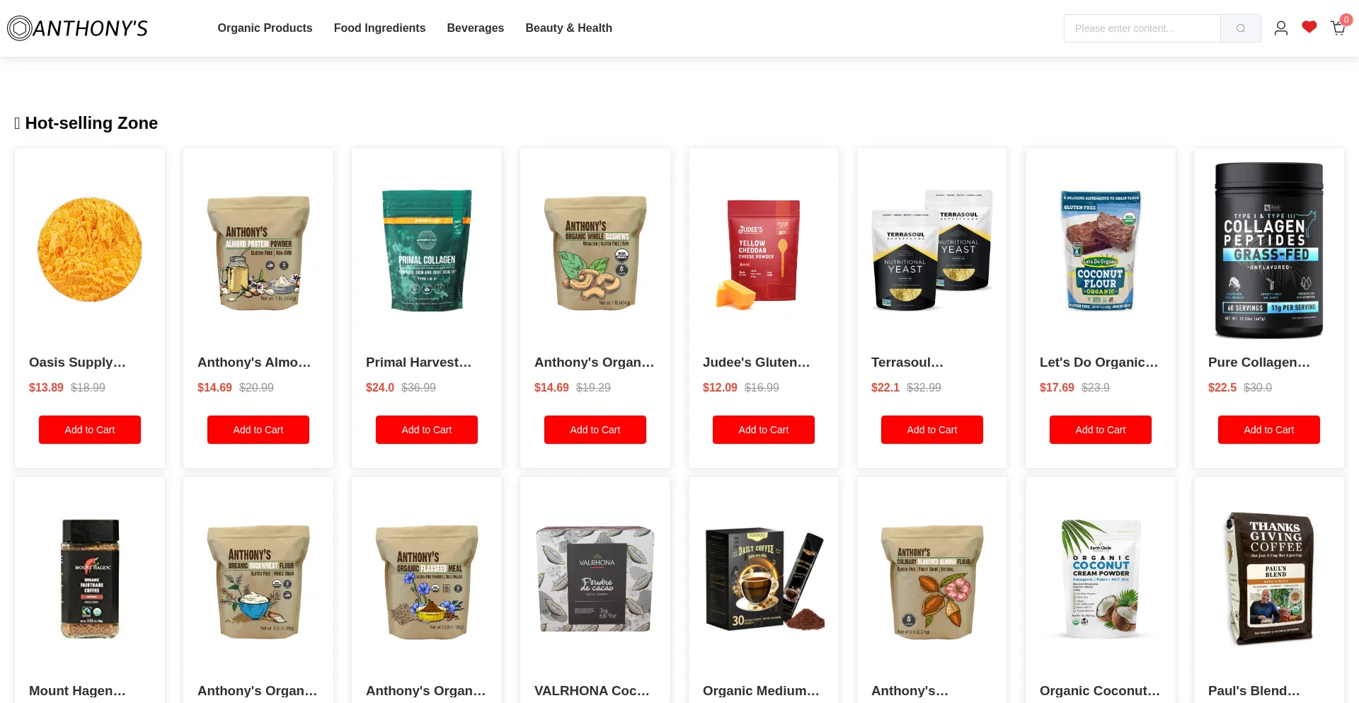 Explore Anthony's Organic products including instant coffee, collagen peptide powder, nutritional yeast, almond flour, cocoa powder, cheddar cheese powder, heavy cream powder, a...