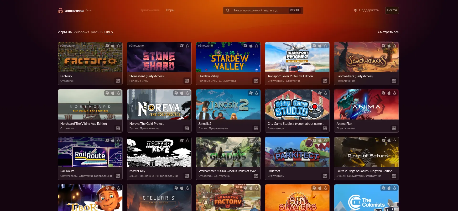 Доступные приложения и игры для Mac, Windows и Linux.
