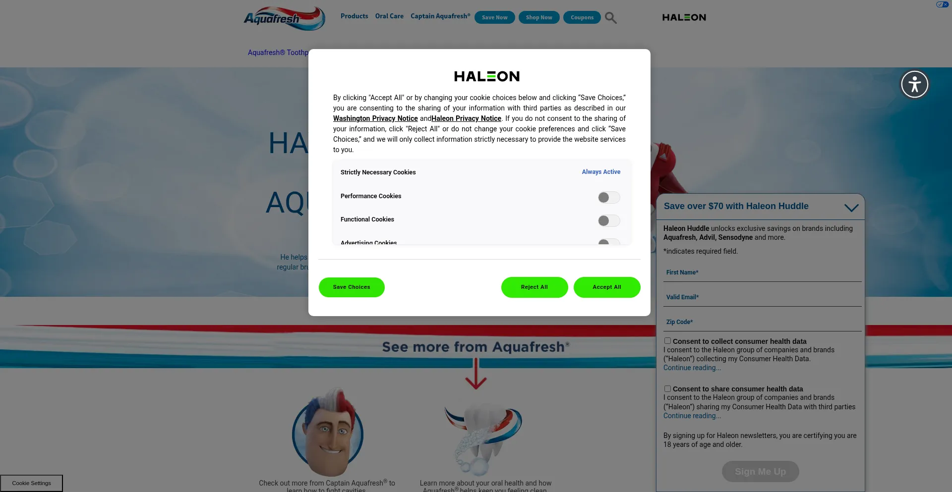O site implementa mecanismos de consentimento de cookies em conformidade com regulamentações de privacidade como GDPR ou CCPA. Isso demonstra que aquafresh.com adere a padrões de proteção de dados e fornece aos usuários controle sobre práticas de coleta de dados pessoais.