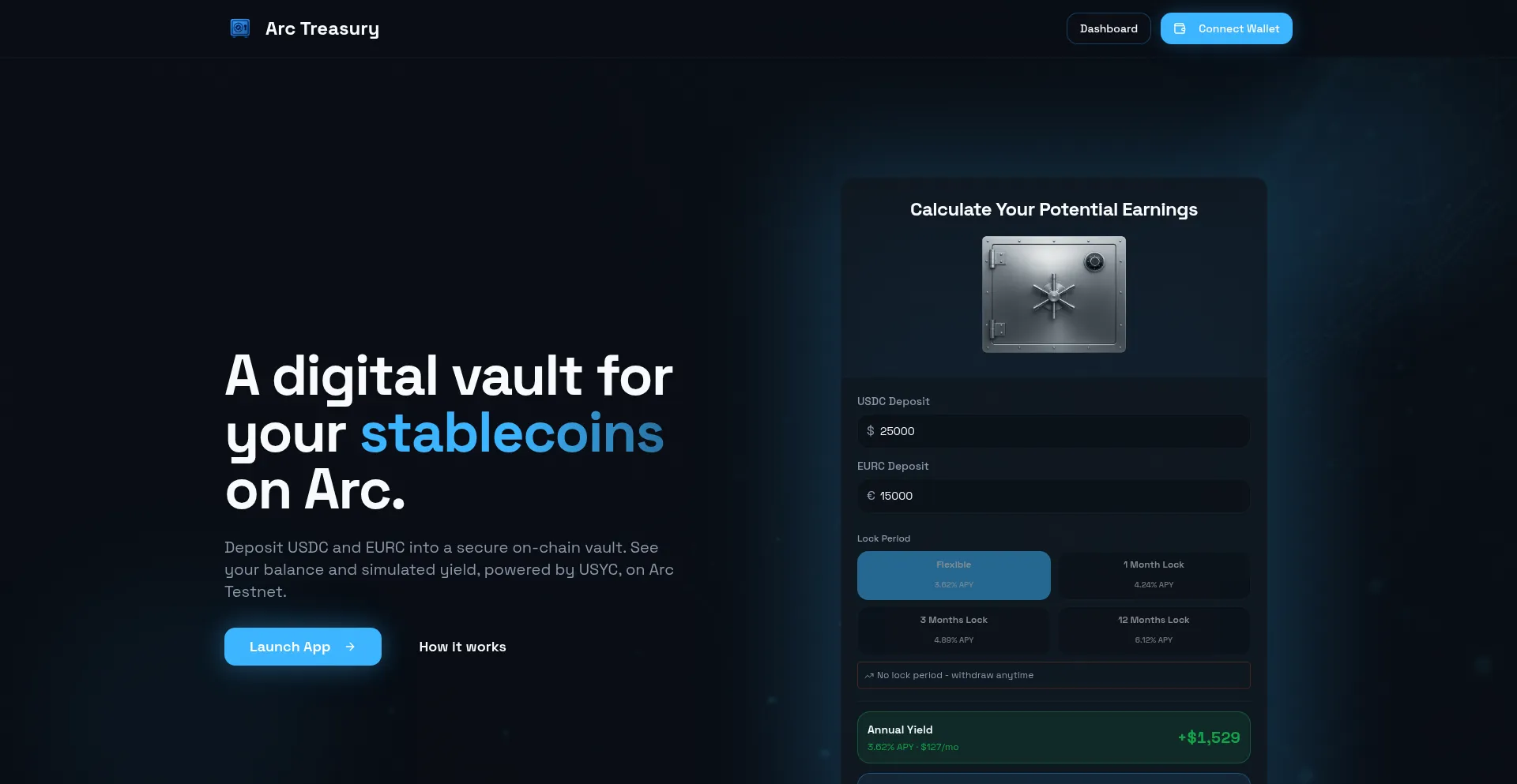 Deposit USDC and EURC into a secure on-chain vault. Earn up to 6.85% APY backed by US Treasury bills on Arc Network. Flexible and locked positions available.