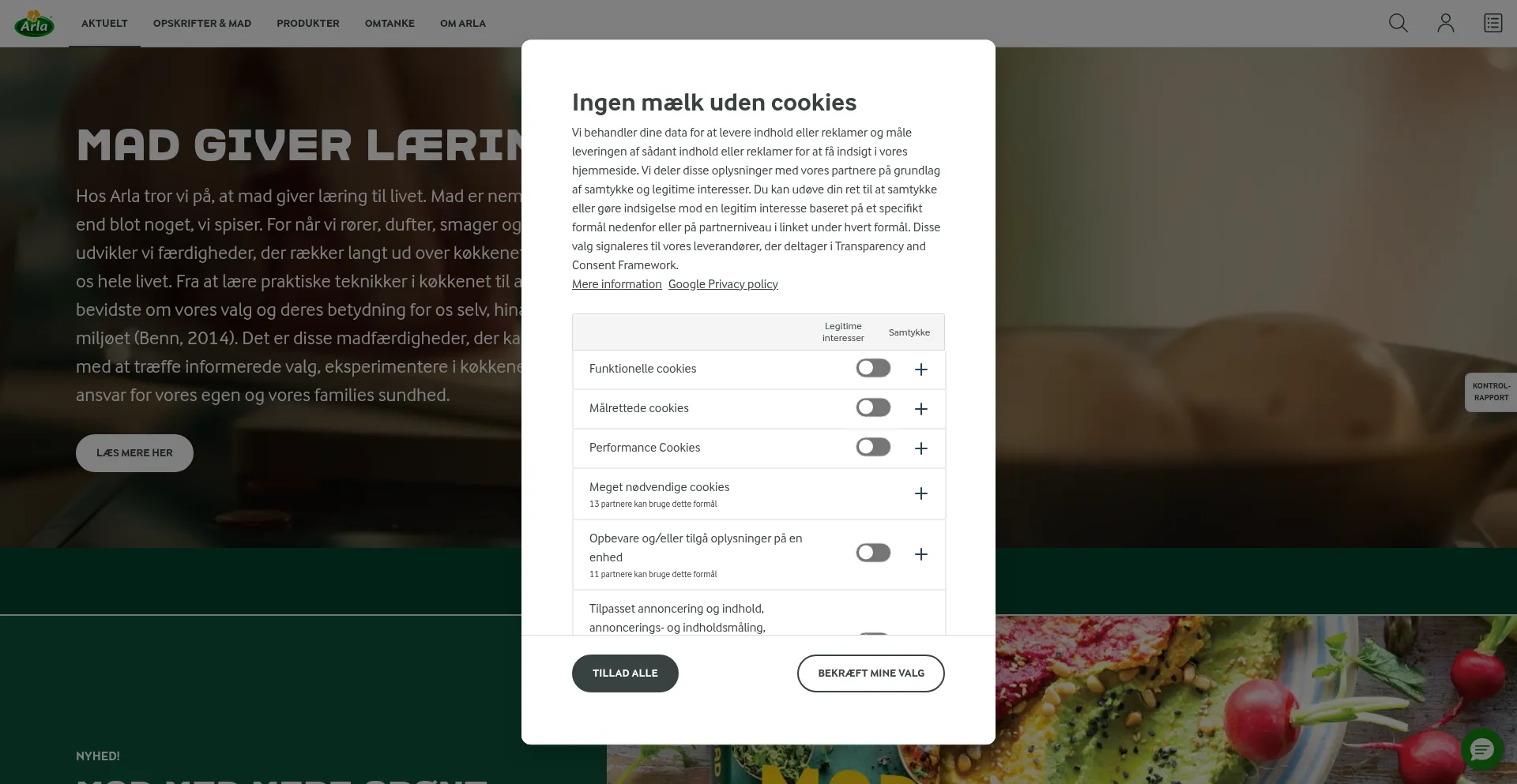 O site implementa mecanismos de consentimento de cookies em conformidade com regulamentações de privacidade como GDPR ou CCPA. Isso demonstra que arla.dk adere a padrões de proteção de dados e fornece aos usuários controle sobre práticas de coleta de dados pessoais.