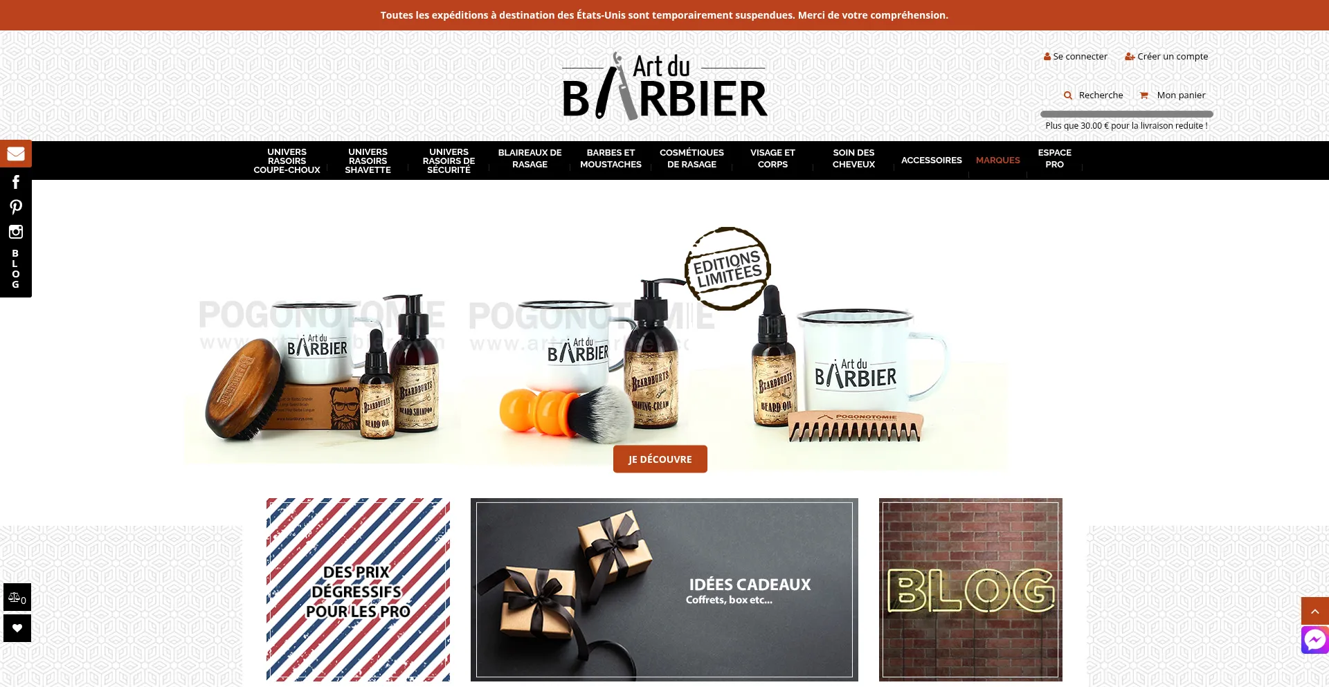 Vente de rasoirs coupe-chou, articles de rasage, cosmétiques pour hommes et produits d'entretien de la barbe et des moustaches.