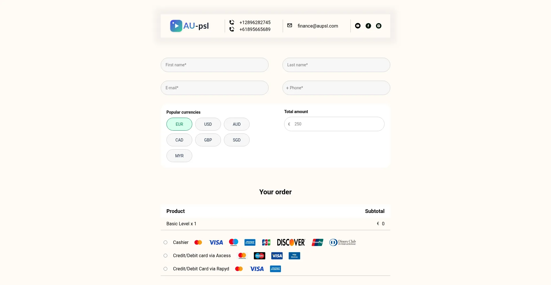 O site implementa formulários de coleta de dados solicitando informações pessoais incluindo nomes, endereços de e-mail, números de telefone ou outros detalhes sensíveis. Os usuários devem verificar a legitimidade de aupsl.com e revisar políticas de privacidade antes de enviar dados pessoais.