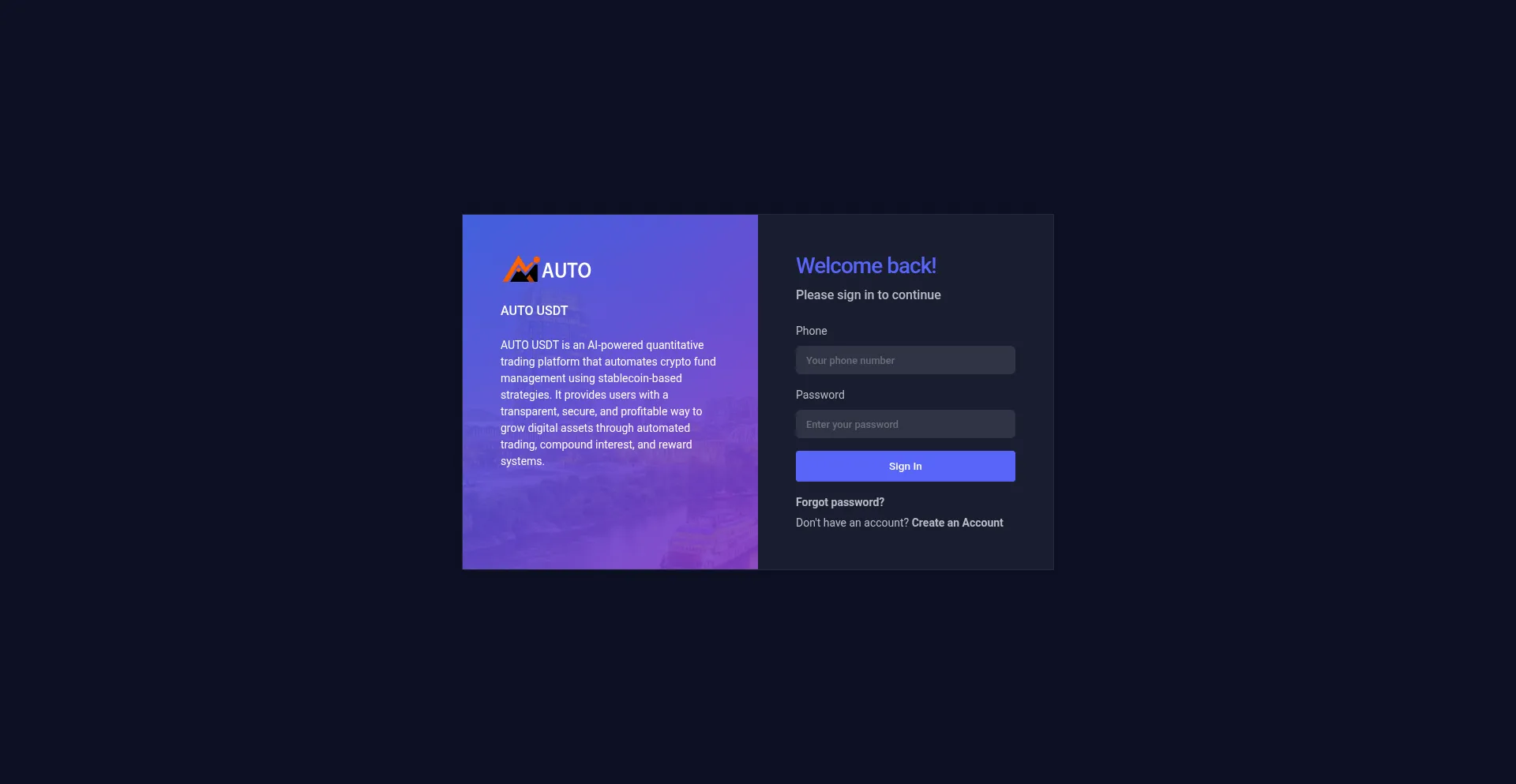 AUTO USDT is an AI-powered quantitative trading platform that automates crypto fund management using stablecoin-based strategies.