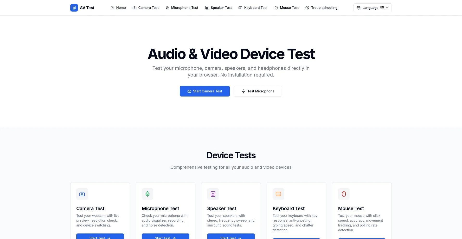 Free mic test, camera test, speaker test & headphone test online. Check microphone, test mic audio, webcam quality & speakers in browser. Complete audio video device tester.