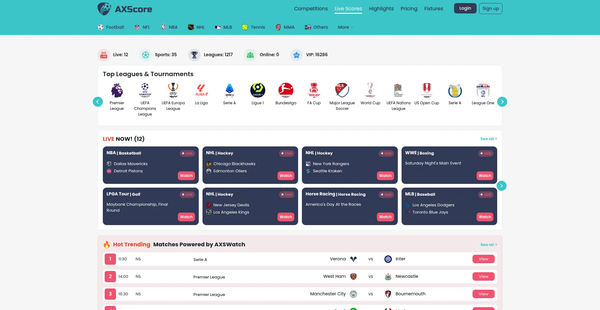 Watch live sports streams on AXSWatch. Get today’s live matches, football scores, and fixtures with no ads. Enjoy streaming live sports including football, MLS, NFL, NBA, NHL,...