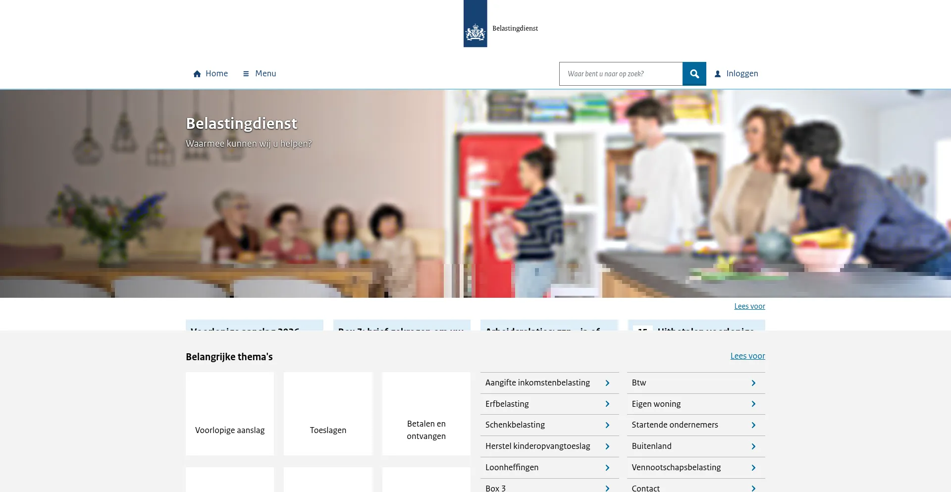 Startpunt voor belastingen. Lees hoe u aangifte doet en wanneer wij uw voorlopige aanslag uitbetalen. Of vind een antwoord op uw vraag in het menu en bij belangrijke thema's.