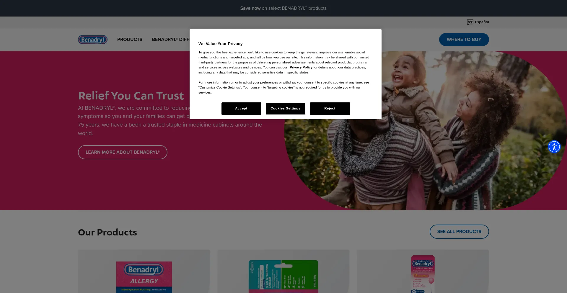 O site implementa mecanismos de consentimento de cookies em conformidade com regulamentações de privacidade como GDPR ou CCPA. Isso demonstra que benadryl.com adere a padrões de proteção de dados e fornece aos usuários controle sobre práticas de coleta de dados pessoais.