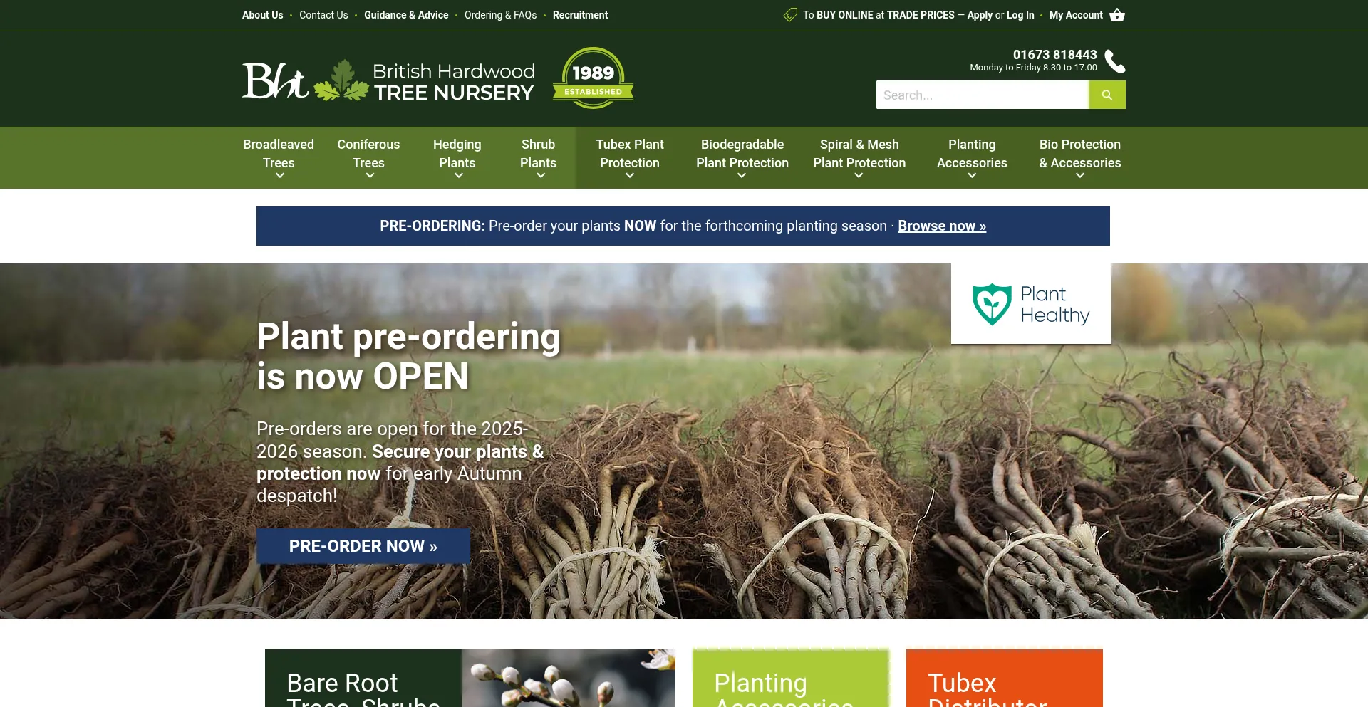 British Hardwood Tree Nursery supply native bareroot trees & hedging plants of UK provenance with planting accessories. Tubex stockist. Nationwide delivery.