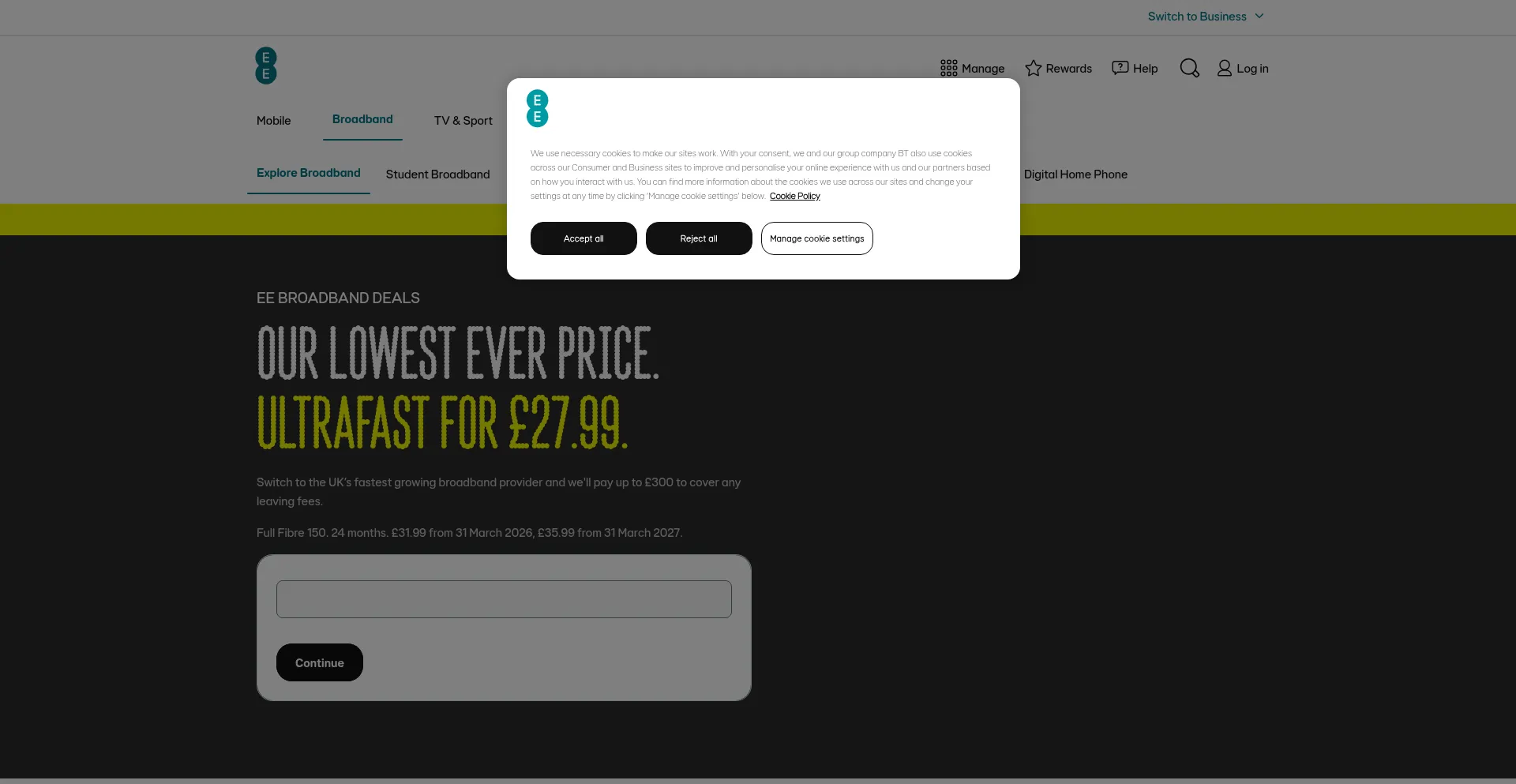 O site implementa mecanismos de consentimento de cookies em conformidade com regulamentações de privacidade como GDPR ou CCPA. Isso demonstra que broadband.ee.co.uk adere a padrões de proteção de dados e fornece aos usuários controle sobre práticas de coleta de dados pessoais.