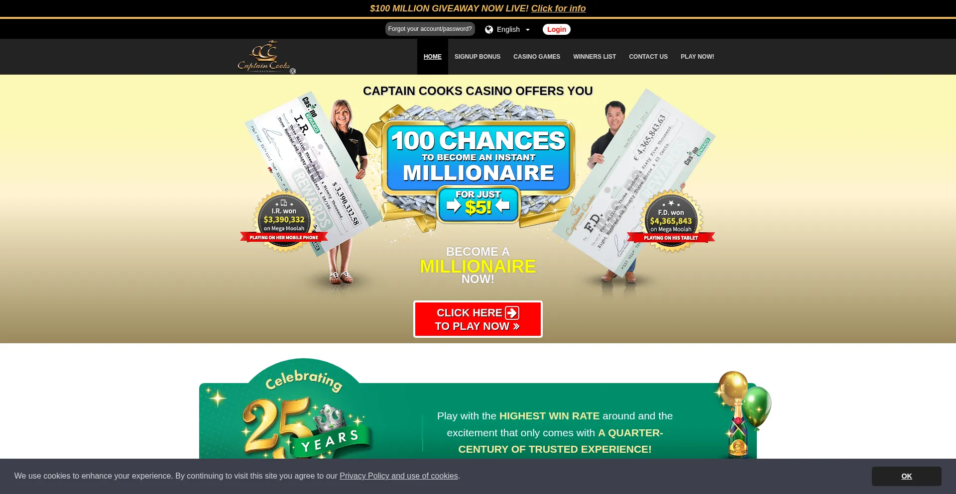 Captain Cooks Casino offers you one of the Best Online Casino Bonuses of $500 Free with 100 Chances to Win upon Sign Up! Play Online Casino Games today!