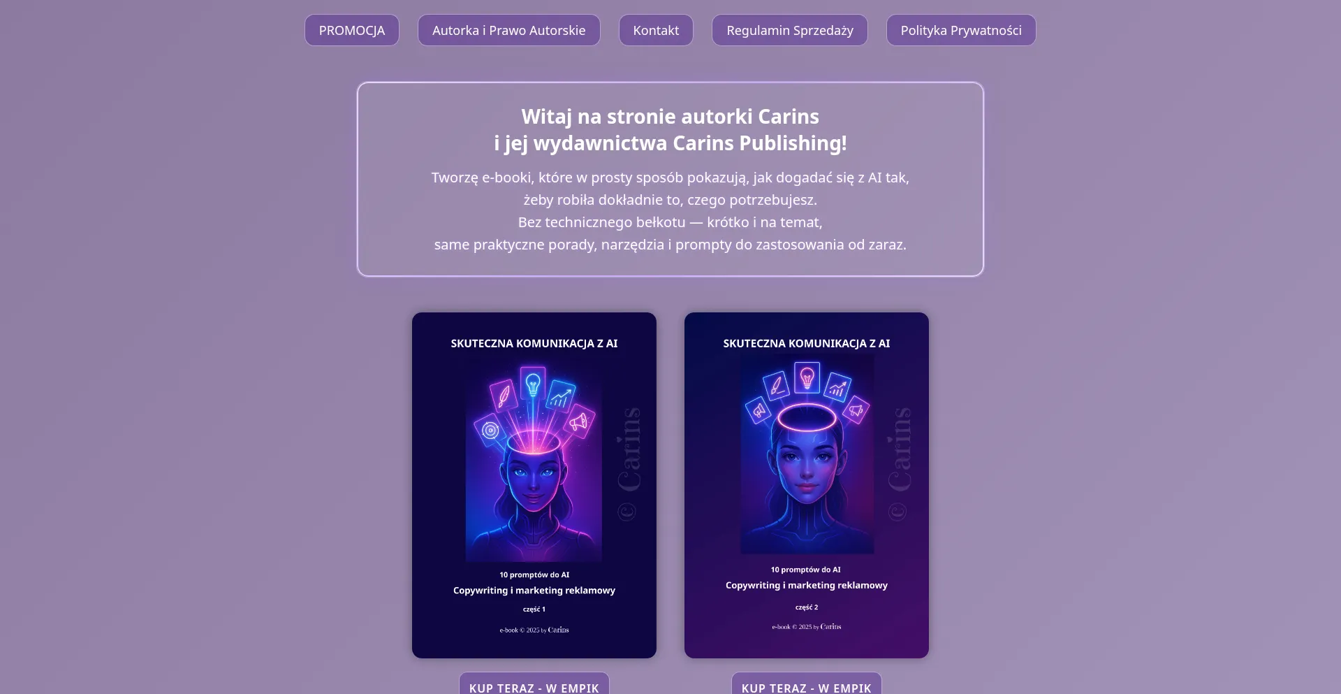 E-booki autorstwa Carins na temat skutecznej komunikacji z AI (sztuczną inteligencją) w różnych dziedzinach życia i biznesu, wydawnictwo Carins Publishing. Ebooki o komunik...