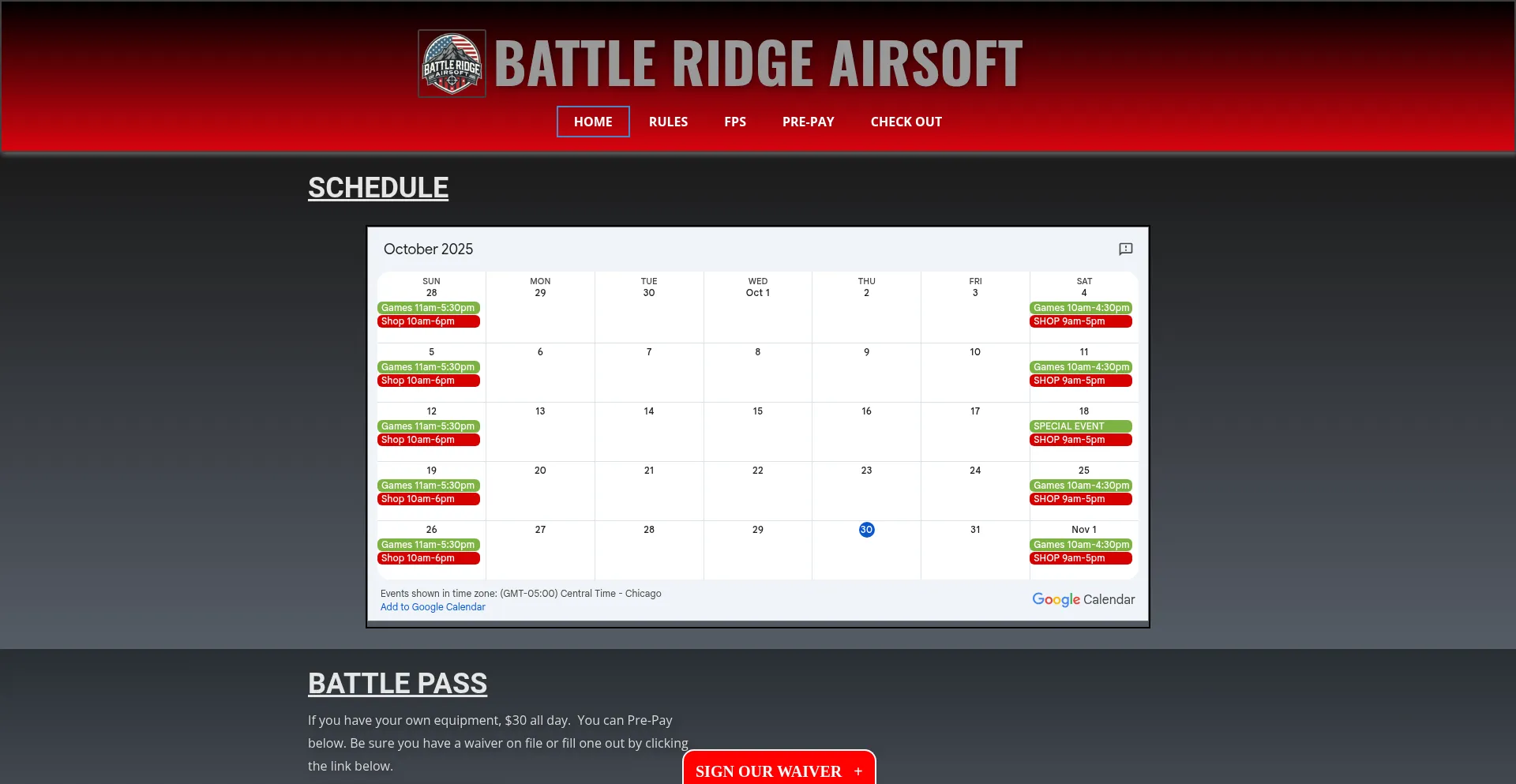 SCHEDULE BATTLE PASS If you have your own equipment, $30 all day.  You can Pre-Pay below. Be sure you have a waiver on file or fill one out by clicking the link below. PRE-PAY ...