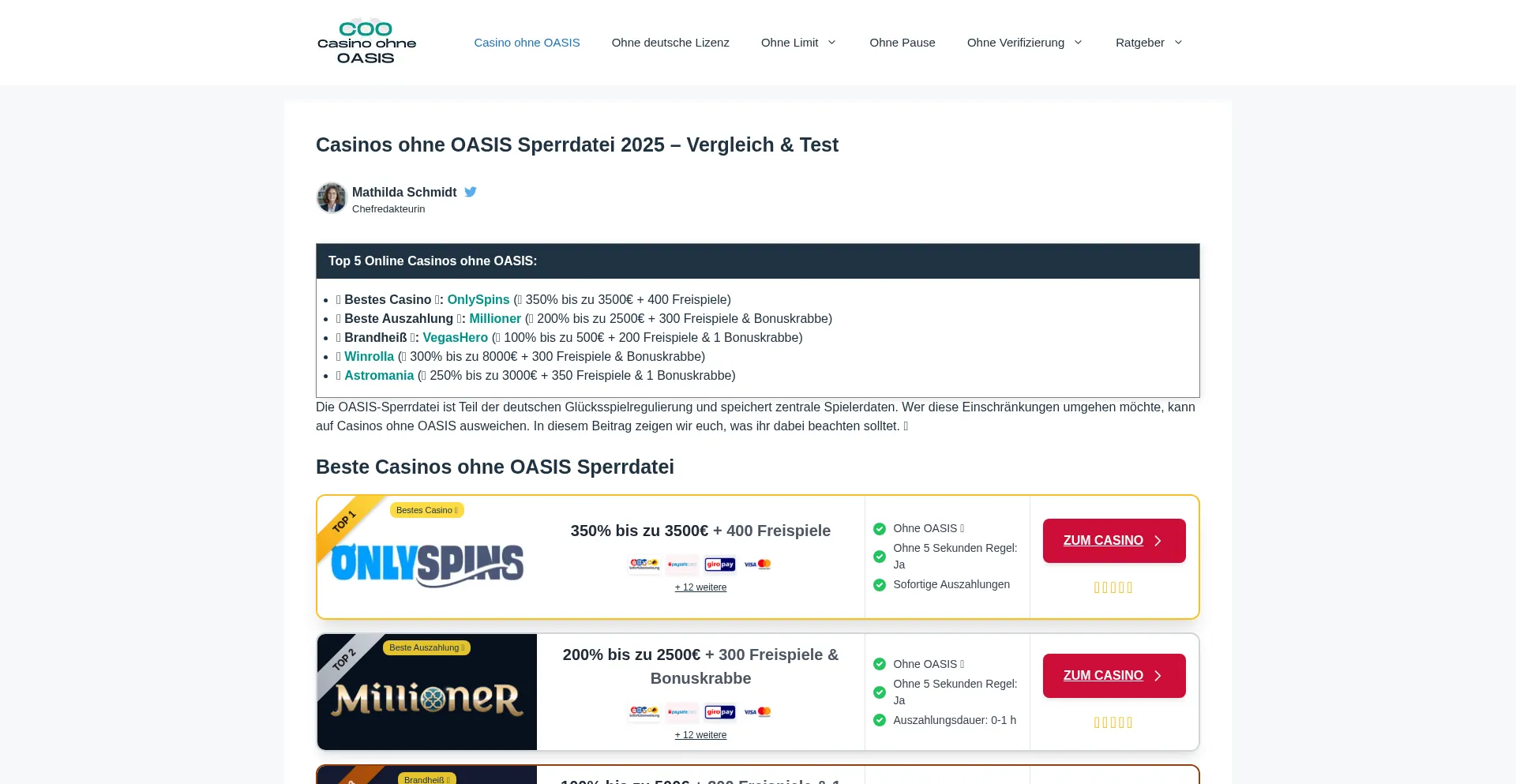Beste Online Casinos ohne OASIS Sperrdatei 2025