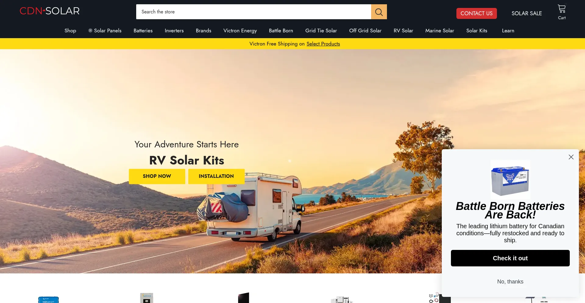Shop CDN Solar for top solar panels, inverters, eBox, Victron products, LFP batteries, and generators. Quality Canadian solar solutions for homes, RVs, and off-grid systems