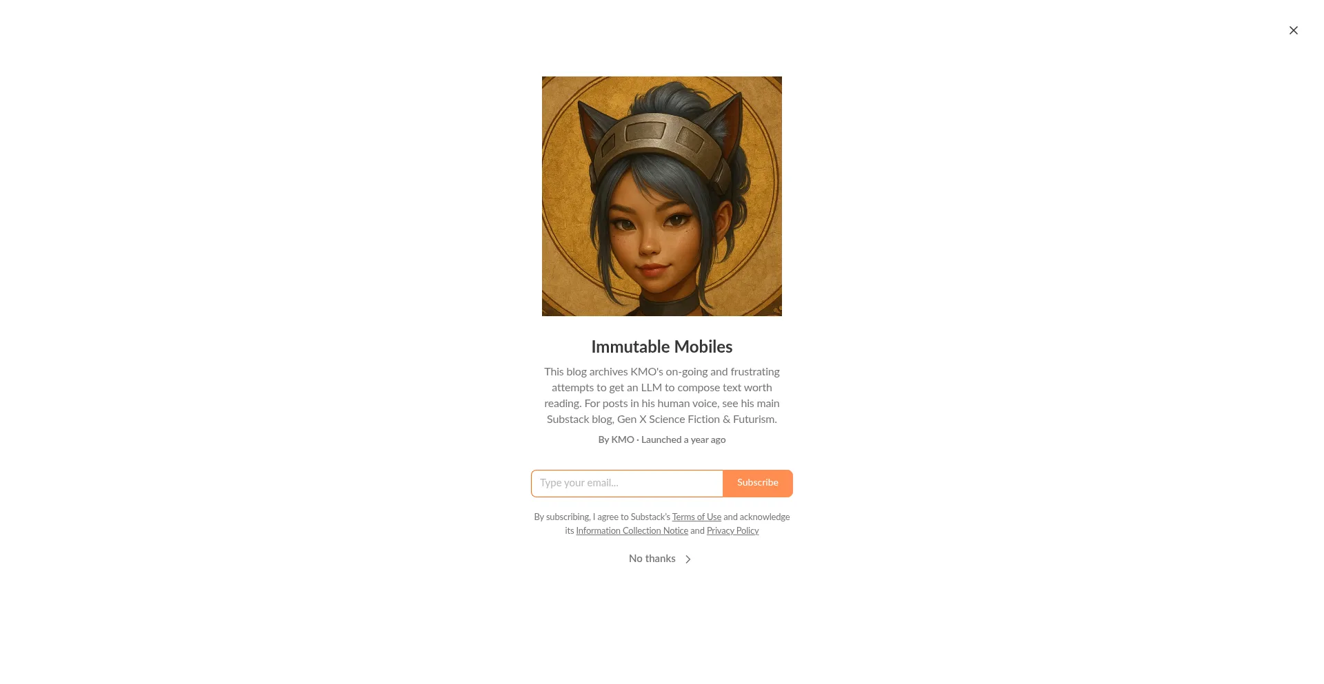 This blog archives KMO's on-going and frustrating attempts to get an LLM to compose text worth reading. For posts in his human voice, see his main Substack blog, Gen X Science F...