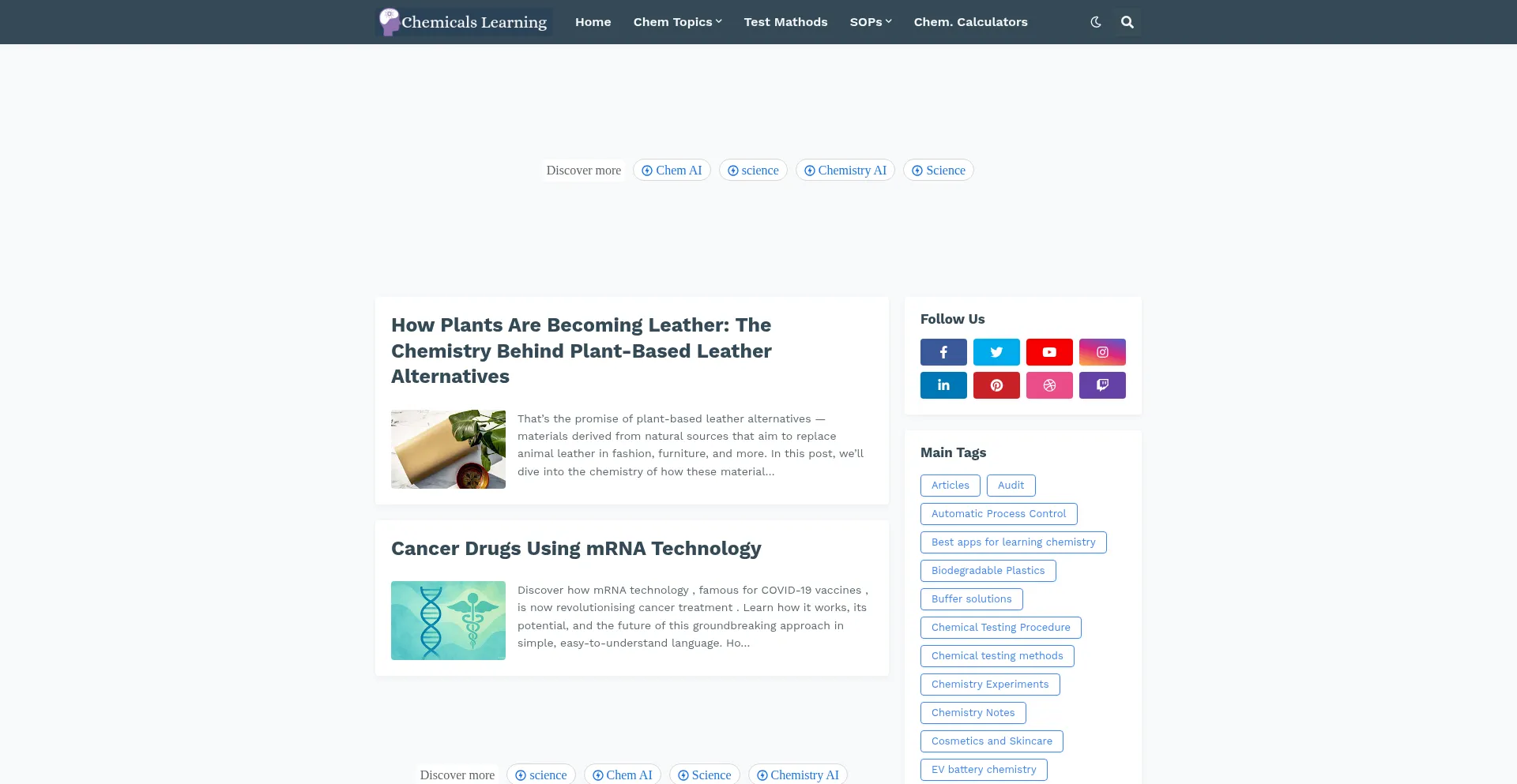 A presença de links de redes sociais no site indica que chemicalslearning.com mantém contas oficiais em redes sociais, o que é um sinal positivo de credibilidade e engajamento.
