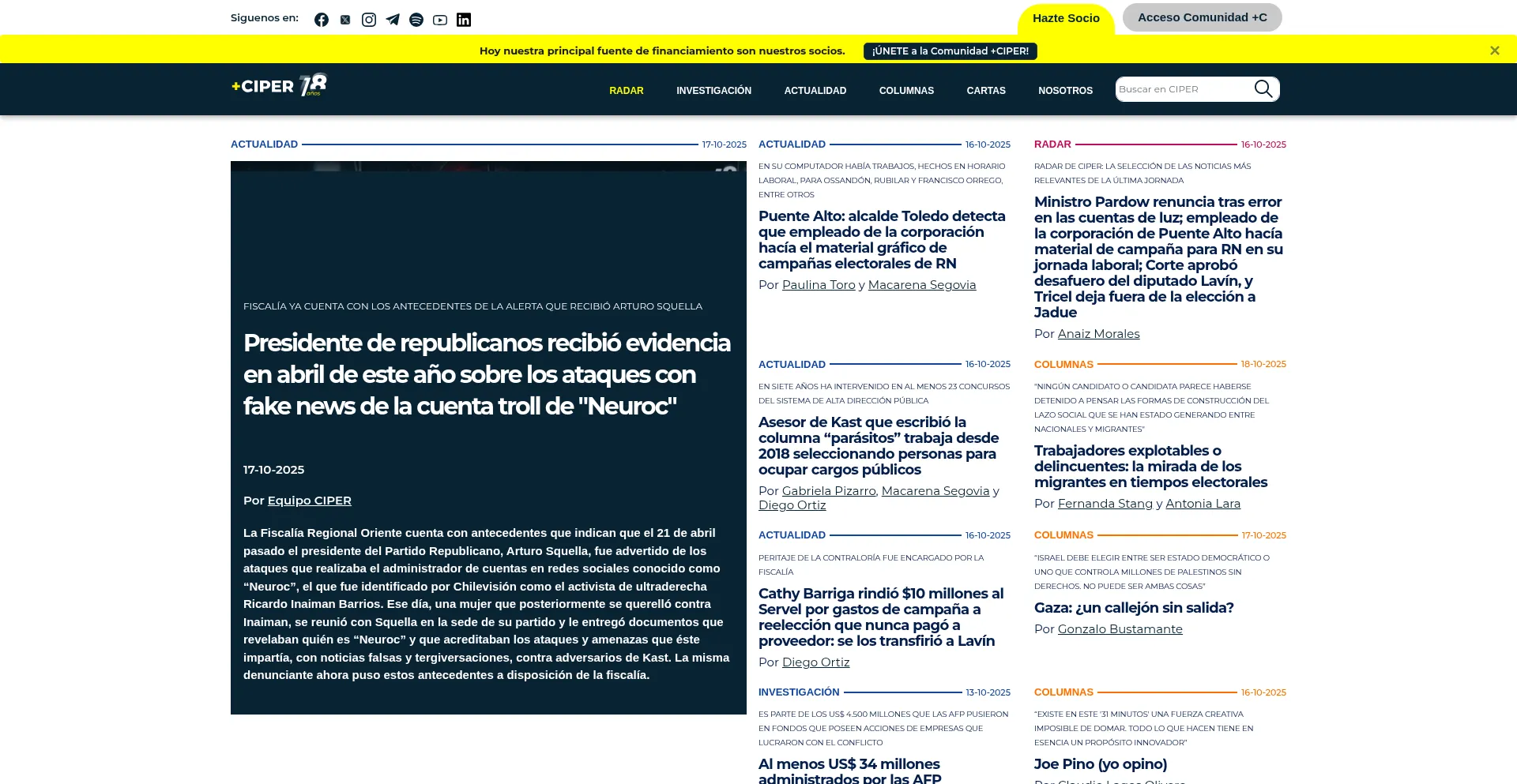 A presença de links de redes sociais no site indica que ciperchile.cl mantém contas oficiais em redes sociais, o que é um sinal positivo de credibilidade e engajamento.