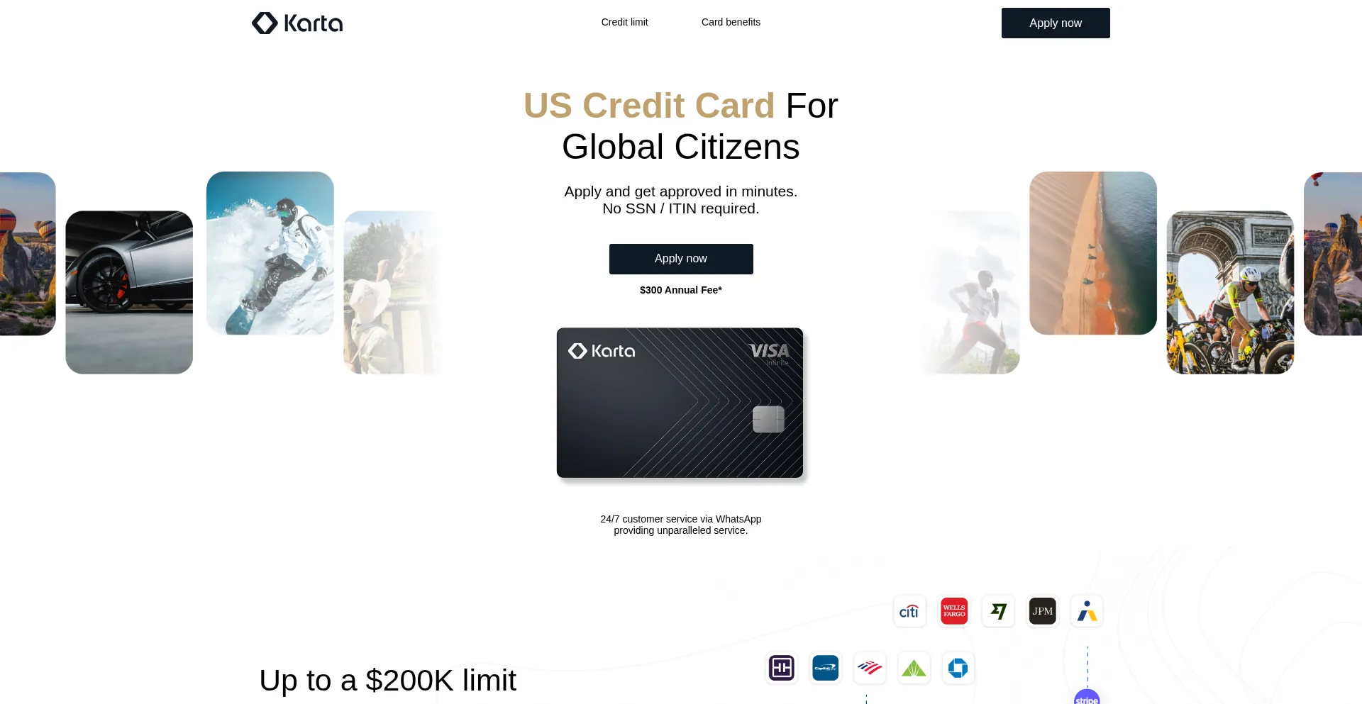 Get Karta Visa Infinite credit card. Up to $200K credit limit, no SSN required, approved in minutes for global citizens. No international fees. Apply today!