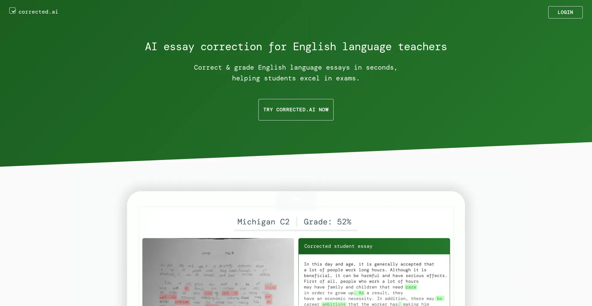 Use AI to correct & grade English language essays in seconds & help your students excel in their exams. Cambridge | IELTS | Michigan | LanguageCert | MSU | NOCN | LRN | ESB | TR...