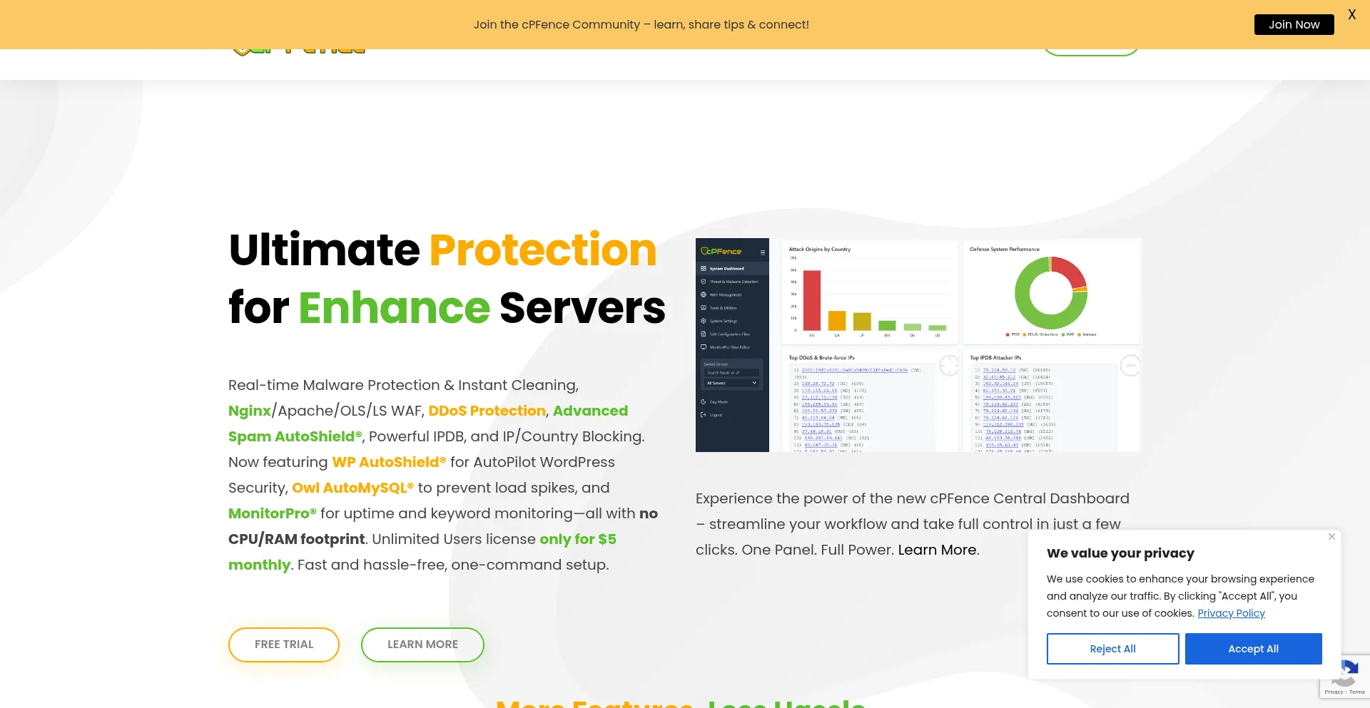 cPFence Real-time Malware Protection & Instant Cleaning, OLS/LS WAF, DDoS Protection, Powerful IPDB, and IP/Country Blocking Module.