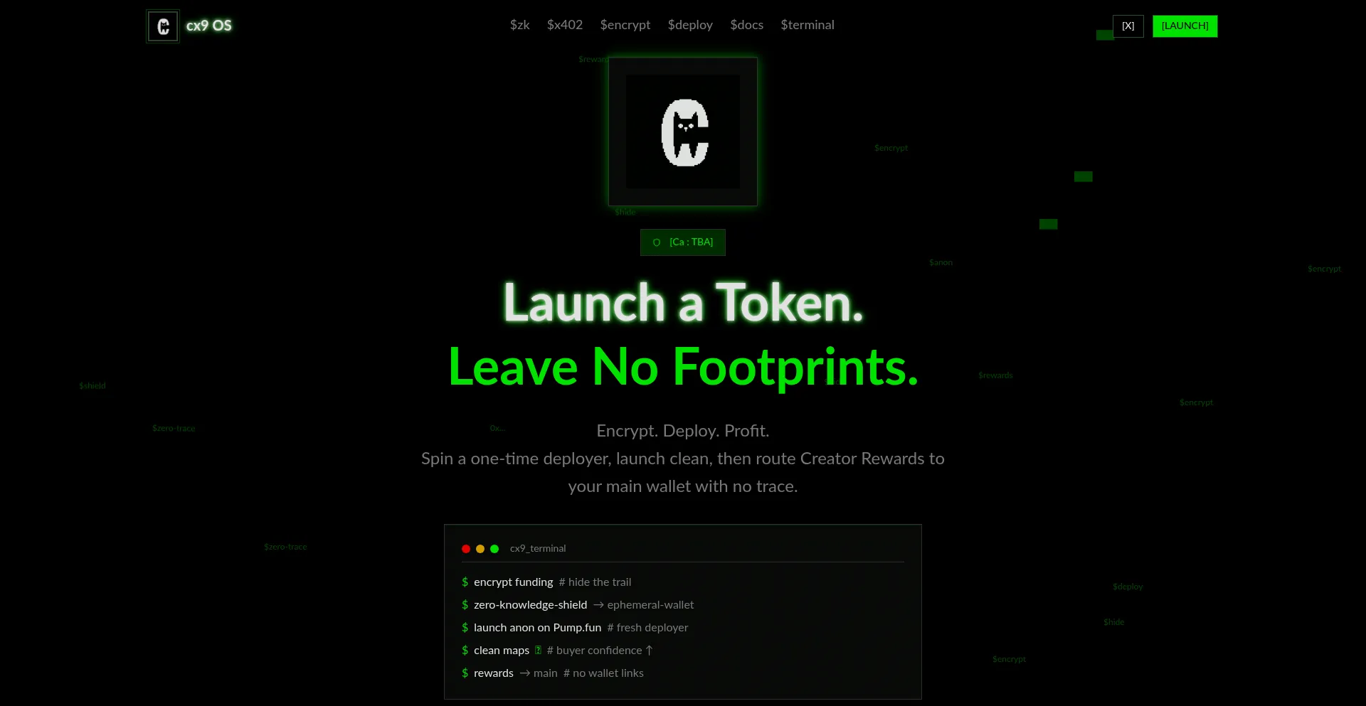 cx9 OS: Privacy-first token deployment on Solana. Encrypt funding, deploy anonymously on Pump.fun, route Creator Rewards with zero trace. Clean bubblemaps. Zero-knowledge shields.