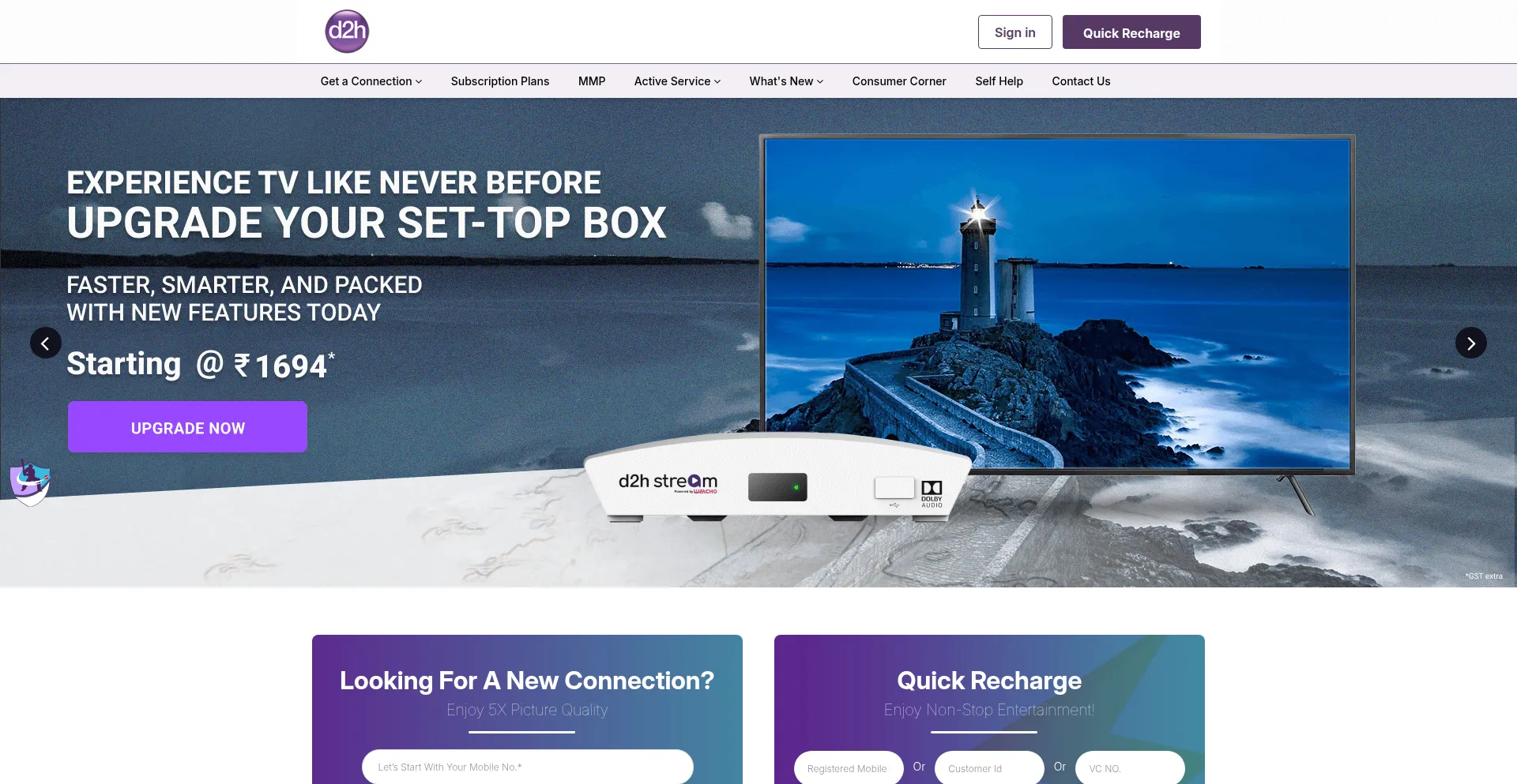 d2h, best dth service provider in India. With widest channel package options d2h offers various dth HD, digital, RF set top boxes.