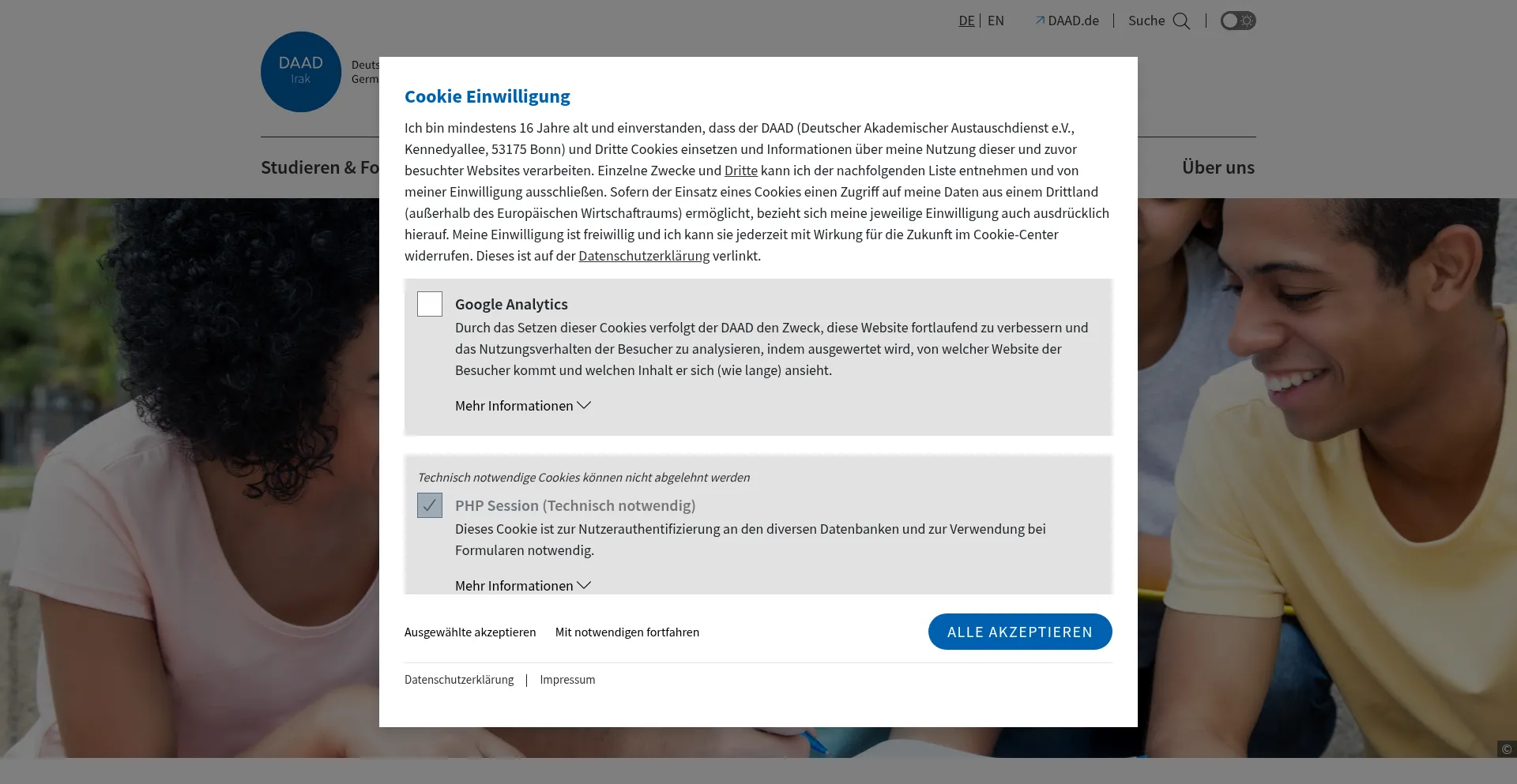 O site implementa mecanismos de consentimento de cookies em conformidade com regulamentações de privacidade como GDPR ou CCPA. Isso demonstra que daad-iraq.org adere a padrões de proteção de dados e fornece aos usuários controle sobre práticas de coleta de dados pessoais.