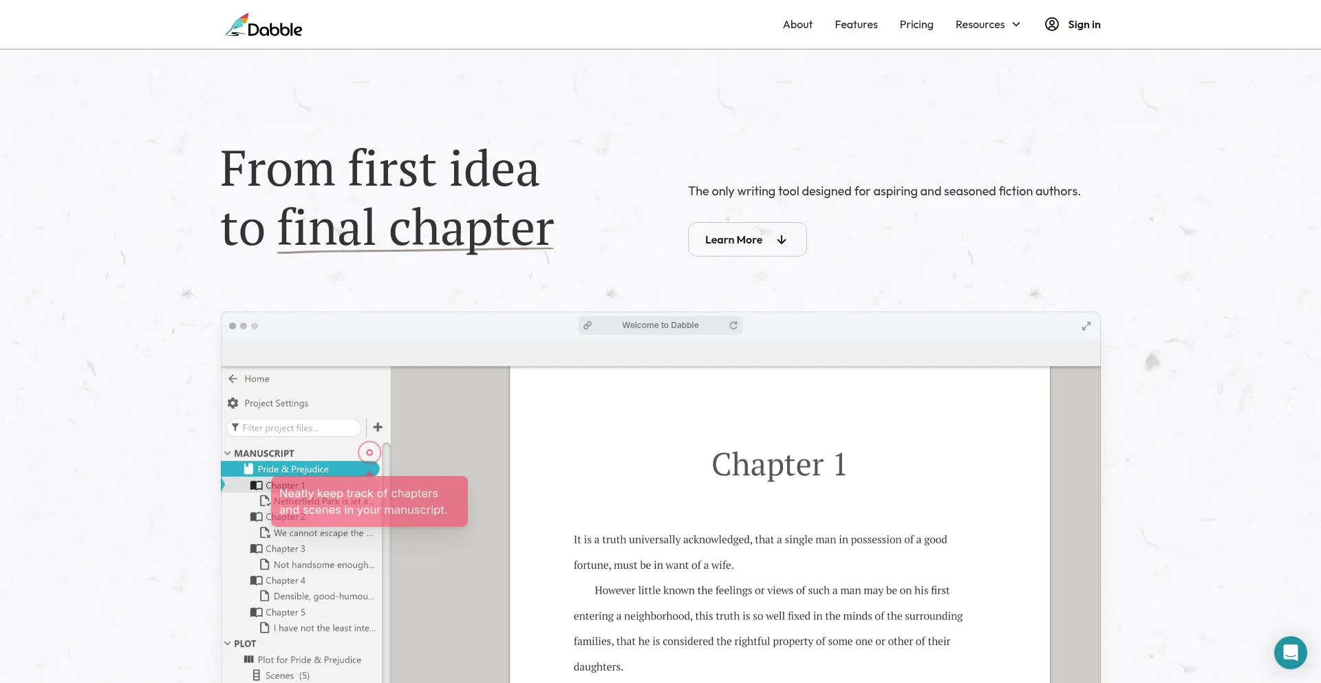 Dabble is an easy-to-use online writing tool, packed with helpful features that allow beginning novelists and published authors to create amazing stories.