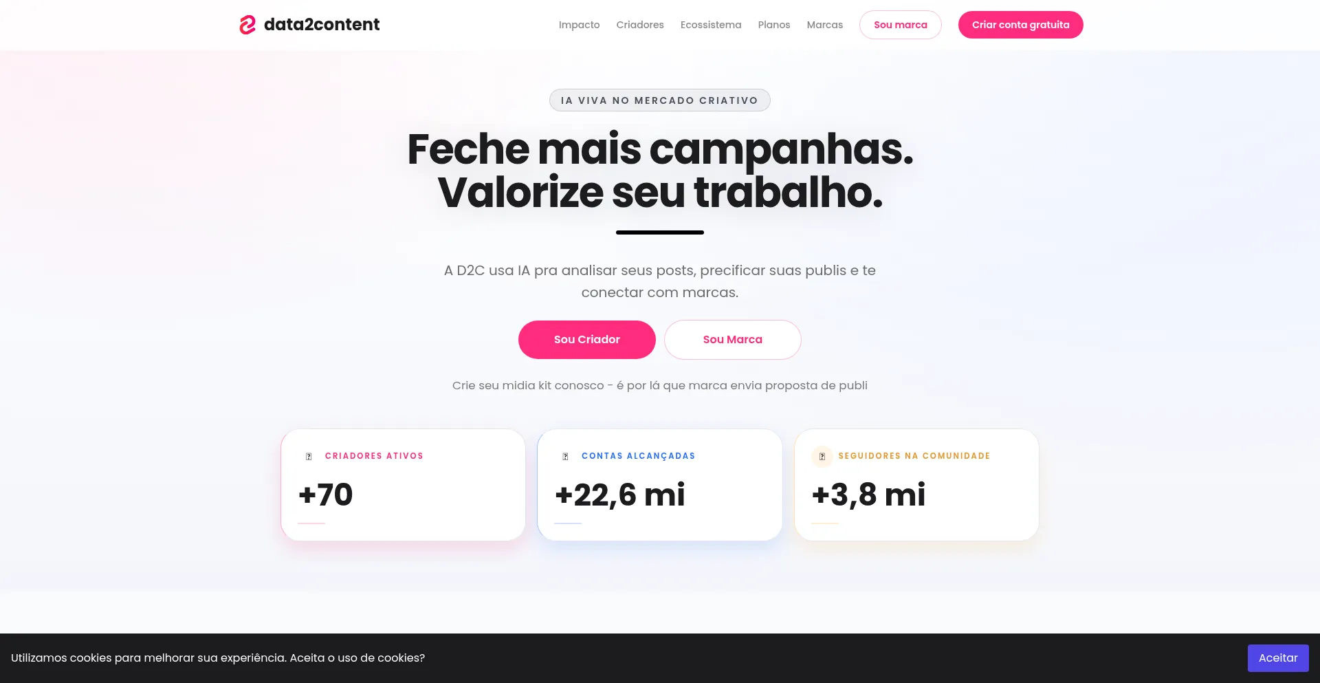 Feche mais campanhas e valorize seu trabalho com a IA da Data2Content. Crie seu mídia kit gratuito e conecte-se a marcas.