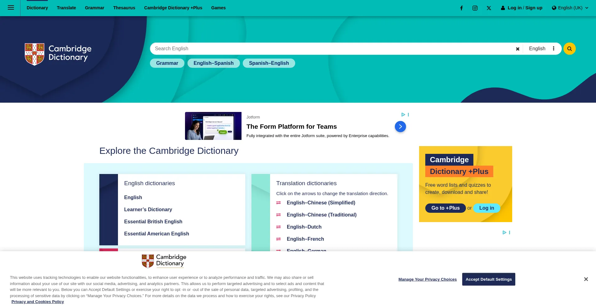 O site implementa mecanismos de consentimento de cookies em conformidade com regulamentações de privacidade como GDPR ou CCPA. Isso demonstra que dictionary.cambridge.org adere a padrões de proteção de dados e fornece aos usuários controle sobre práticas de coleta de dados pessoais.