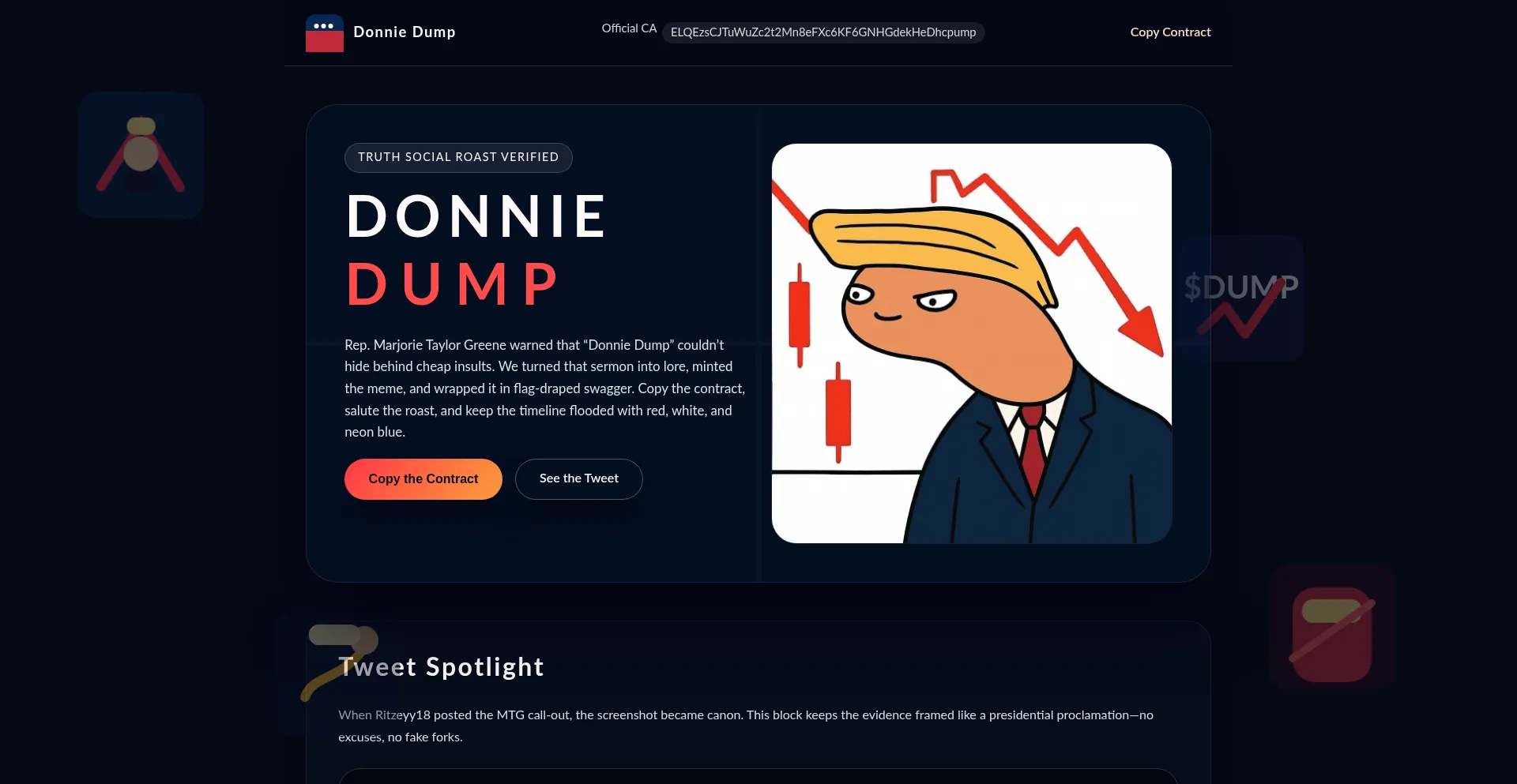 The most American memecoin on the planet. Donnie Dump turns a Truth Social roast into a patriotic movement with a verified contract and nonstop meme fire.