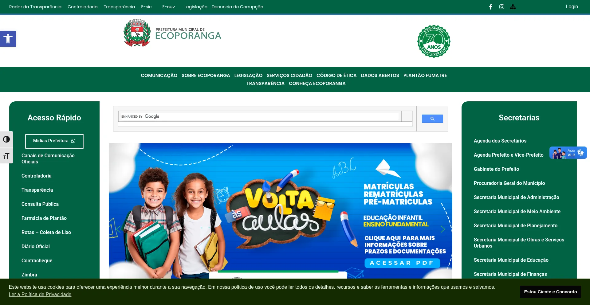 O site implementa mecanismos de consentimento de cookies em conformidade com regulamentações de privacidade como GDPR ou CCPA. Isso demonstra que ecoporanga.es.gov.br adere a padrões de proteção de dados e fornece aos usuários controle sobre práticas de coleta de dados pessoais.