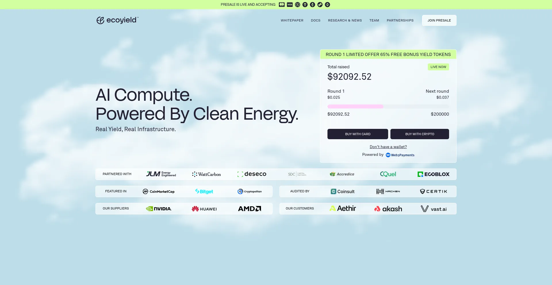 Invest in EcoYield: Earn real yield from AI compute infrastructure fully powered by clean, sustainable energy.