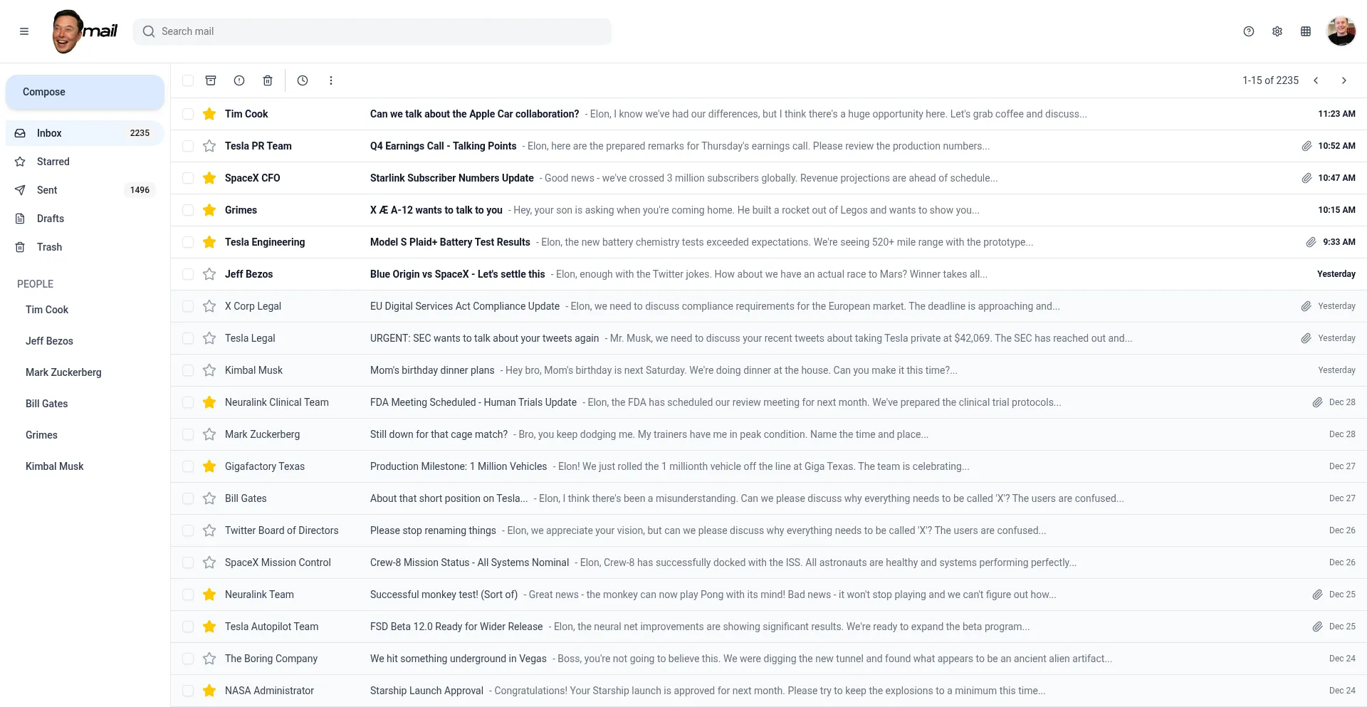 A parody Gmail interface featuring fictional Elon Musk emails