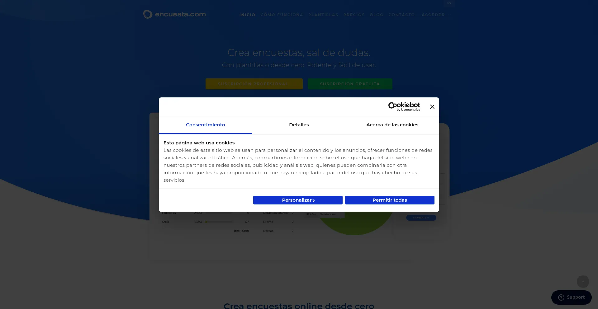 O site implementa mecanismos de consentimento de cookies em conformidade com regulamentações de privacidade como GDPR ou CCPA. Isso demonstra que encuesta.com adere a padrões de proteção de dados e fornece aos usuários controle sobre práticas de coleta de dados pessoais.
