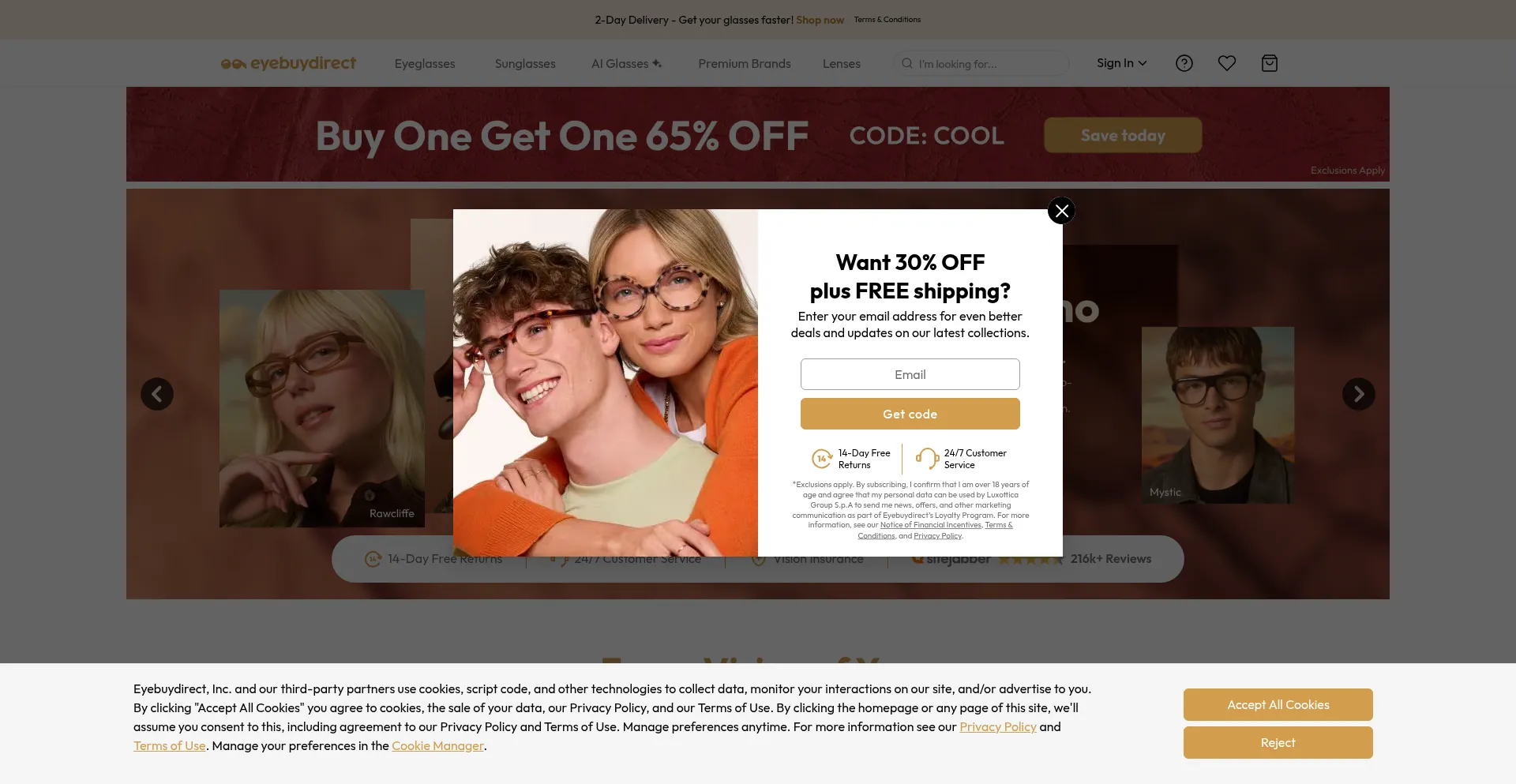 O site implementa mecanismos de consentimento de cookies em conformidade com regulamentações de privacidade como GDPR ou CCPA. Isso demonstra que eyebuydirect.com adere a padrões de proteção de dados e fornece aos usuários controle sobre práticas de coleta de dados pessoais.