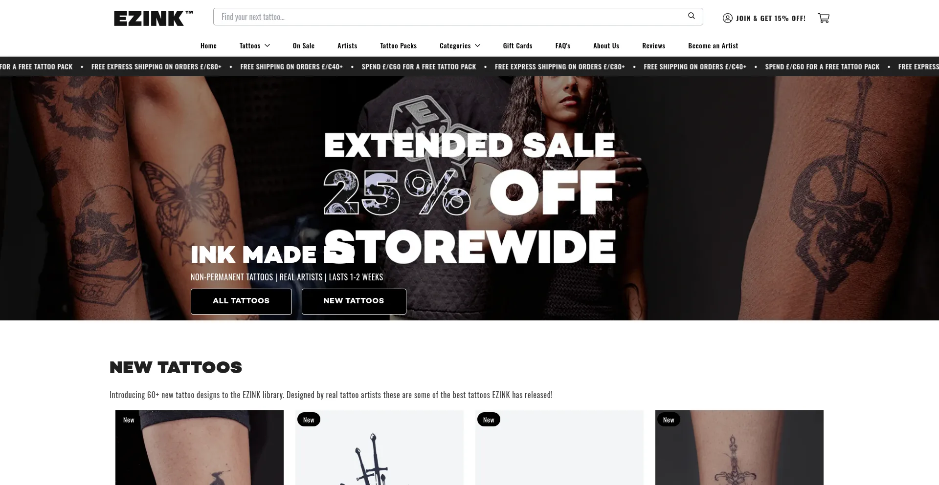 Spend £/€60 or more to unlock a FREE exclusive tattoo pack (including 4 free tattoos and free shipping).