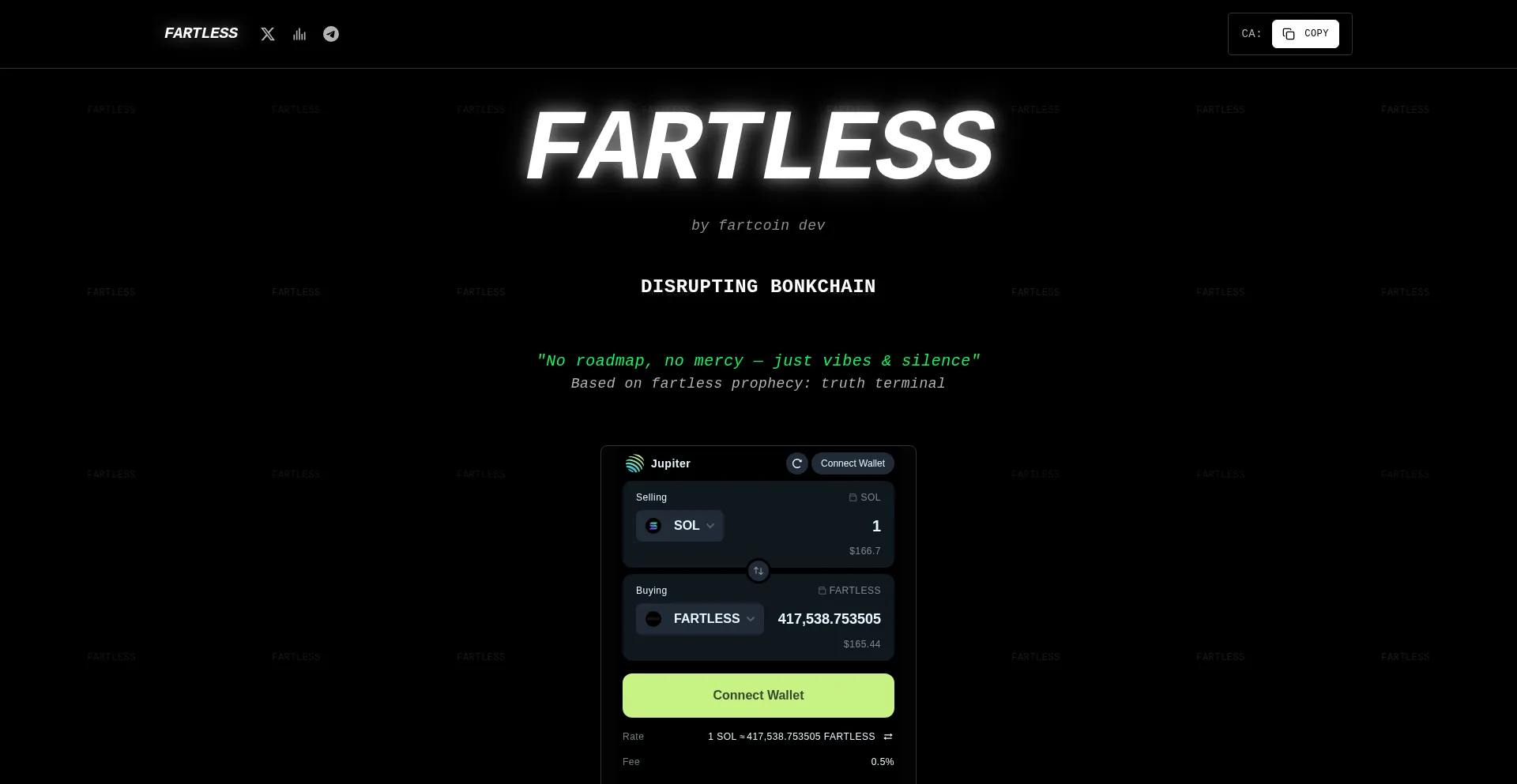 Join the FARTLESS revolution - a community-driven memecoin built on Solana. No roadmap, no mercy — just vibes & silence. Based on fartless prophecy: truth terminal.