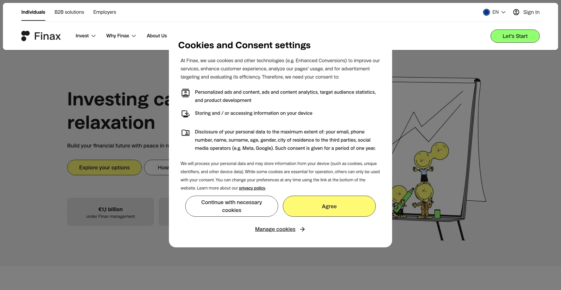 O site implementa mecanismos de consentimento de cookies em conformidade com regulamentações de privacidade como GDPR ou CCPA. Isso demonstra que finax.eu adere a padrões de proteção de dados e fornece aos usuários controle sobre práticas de coleta de dados pessoais.