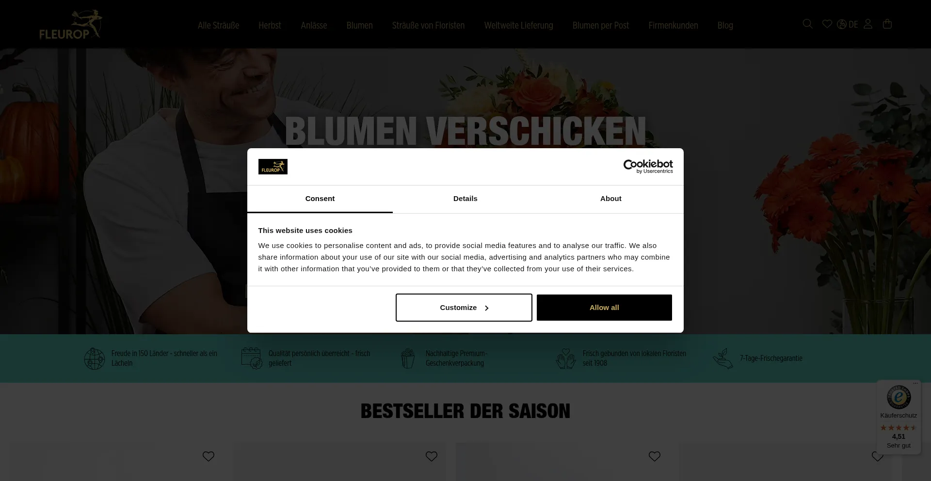 O site implementa mecanismos de consentimento de cookies em conformidade com regulamentações de privacidade como GDPR ou CCPA. Isso demonstra que fleurop.de adere a padrões de proteção de dados e fornece aos usuários controle sobre práticas de coleta de dados pessoais.