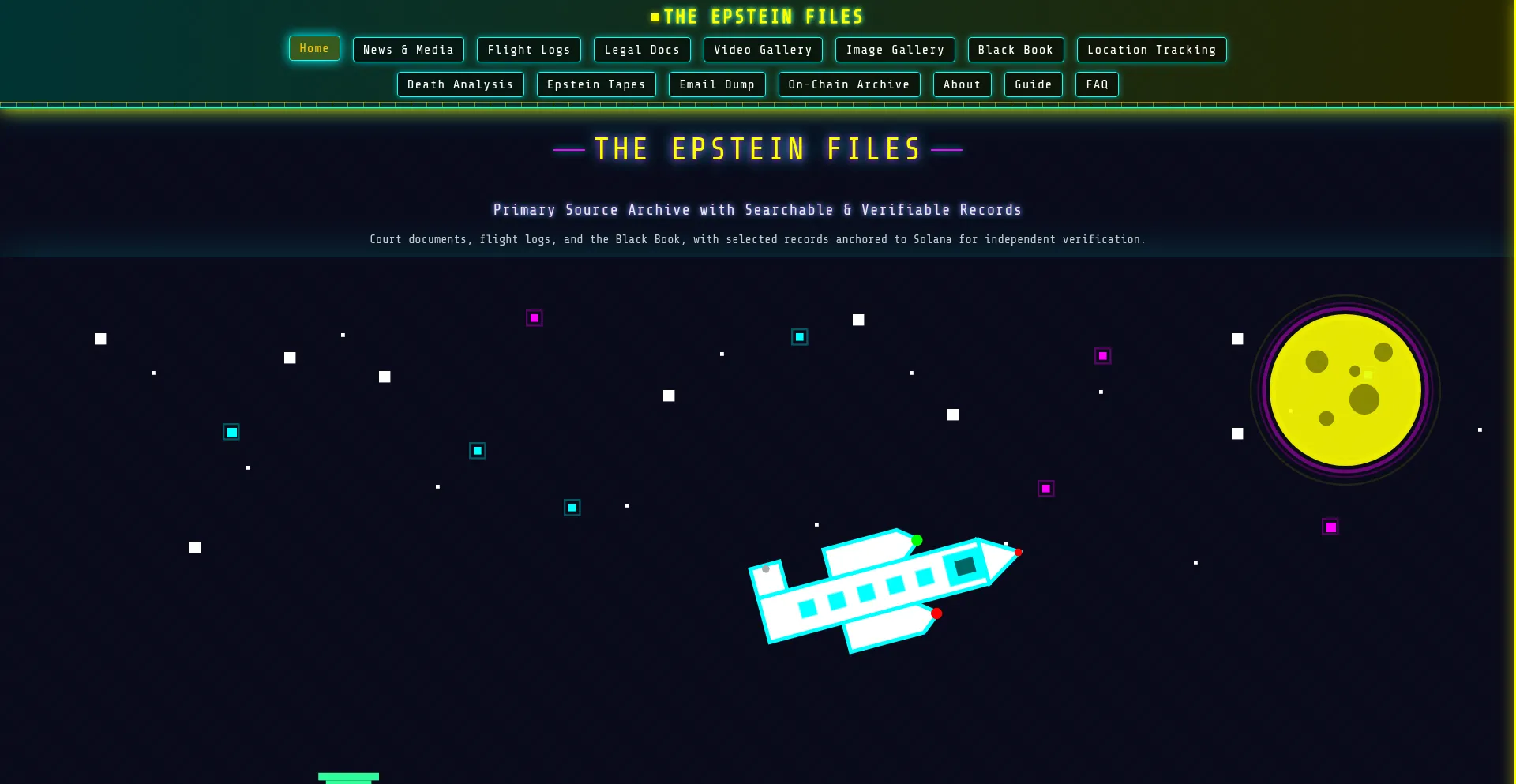 Court documents, flight logs, and the Black Book, with selected records anchored to Solana for independent verification.