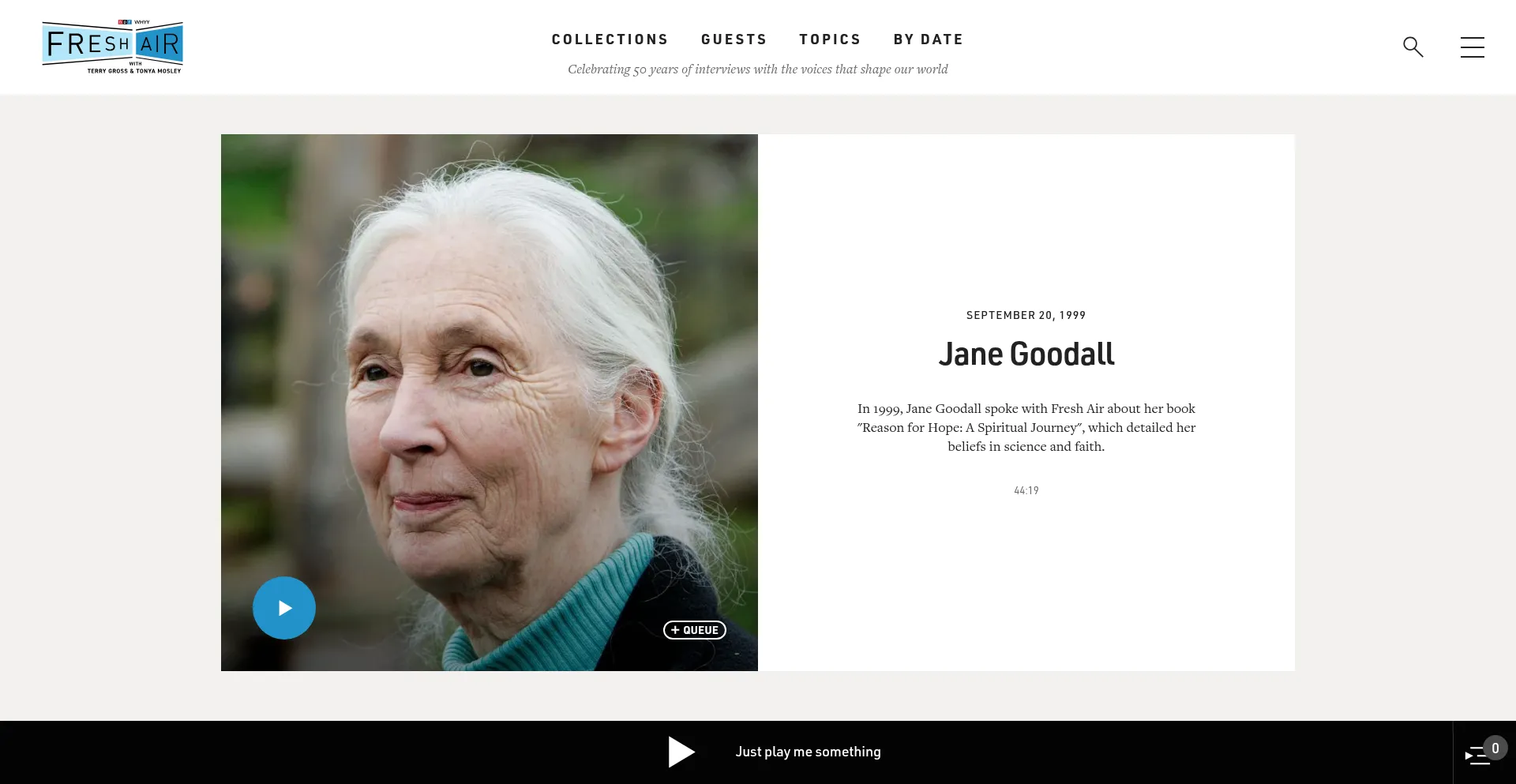 Listen to interviews from more than 40 years of Fresh Air with Terry Gross, the celebrated radio show and podcast produced by WHYY and broadcast by NPR.