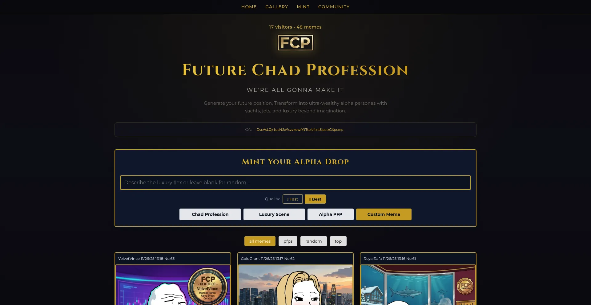 Generate your future position. Transform Wojaks into ultra-wealthy alpha personas with luxury jobs, yachts, jets, and champagne. WAGMI.